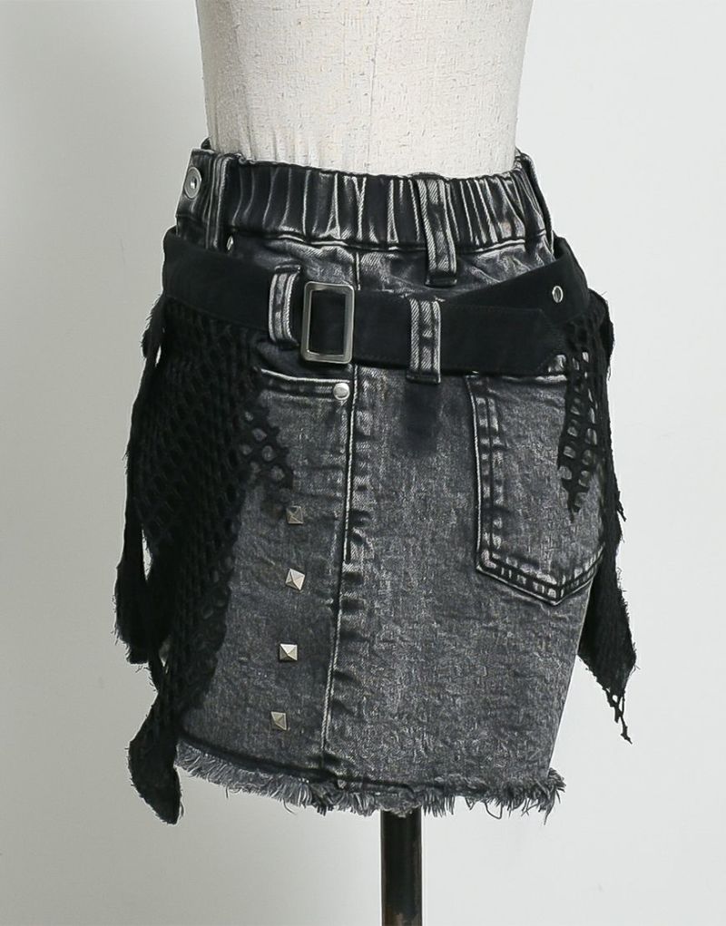 ストレッチ混のブラックデニム素材を使用したショートパンツとグランジテイストのデザインを施したベルトの2Pセットです。