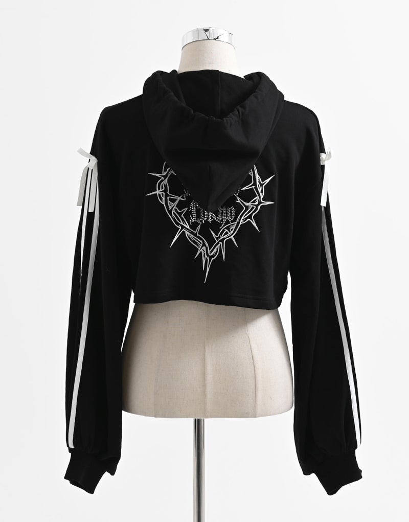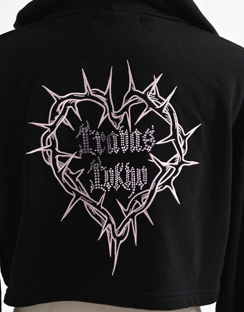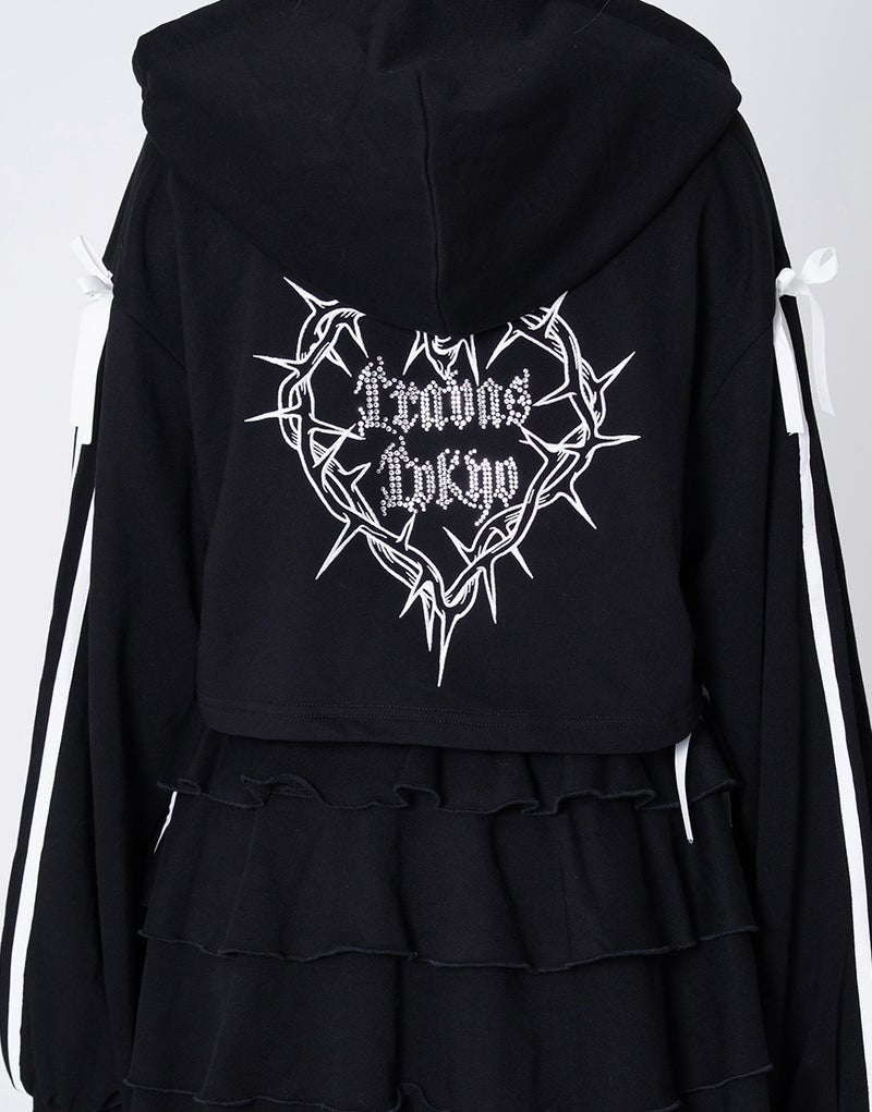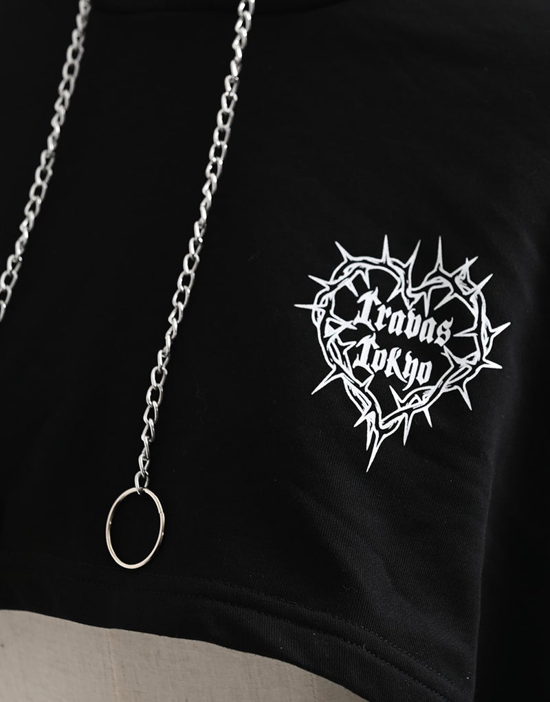 バックスタイルには刺繍とラインストーンを組み合わせた立体的なロゴデザインを施し、後ろ姿まで抜かりない仕上がりに。光を受けてきらめくディテールが、TRAVASらしいゴシック×キュートな世界観を強調します。