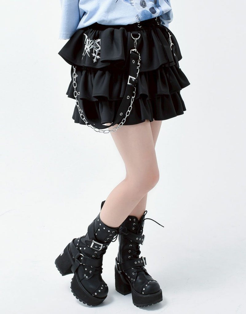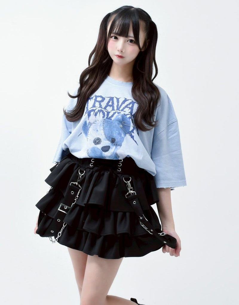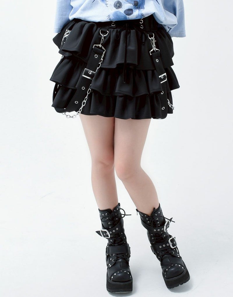ボリューム感のあるティアードフリルに、ハードな印象のチェーン付きサスペンダーを組み合わせた、他にはないデザイン。サスペンダーとチェーンは取り外し可能で、スタイリングの幅が広がります。