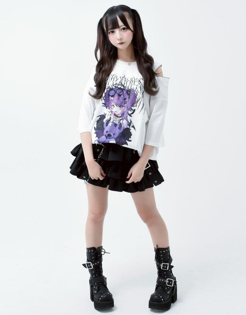 レースアップやベルトパーツなど、ディテールにもこだわった一枚で、地雷系やサブカルコーデ、ライブ参戦服にもおすすめ。トップスをインしてシルエットを引き立てるスタイリングが◎。