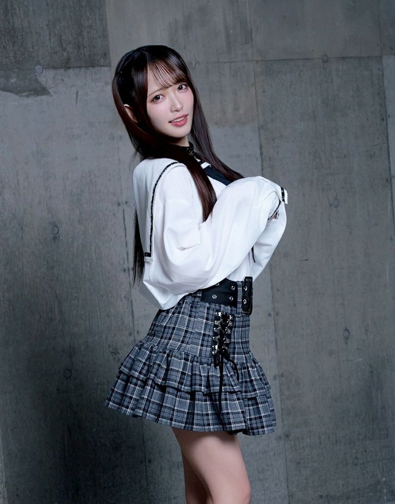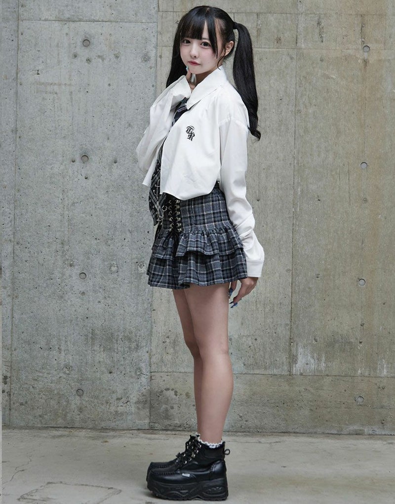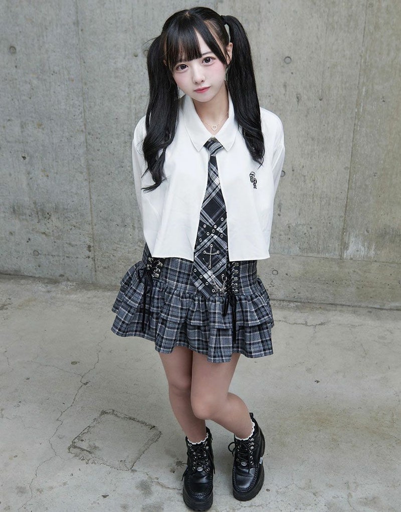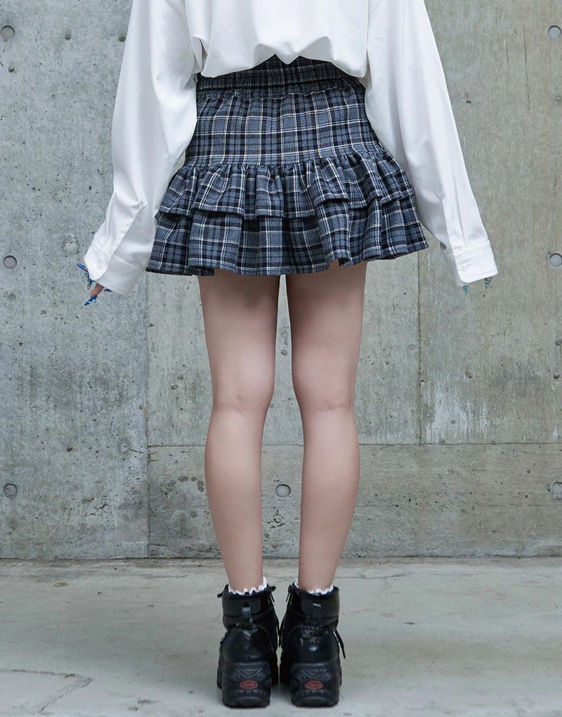 無地のブラックはシックに、チェック柄のグレーはガーリーに仕上げた2色展開。