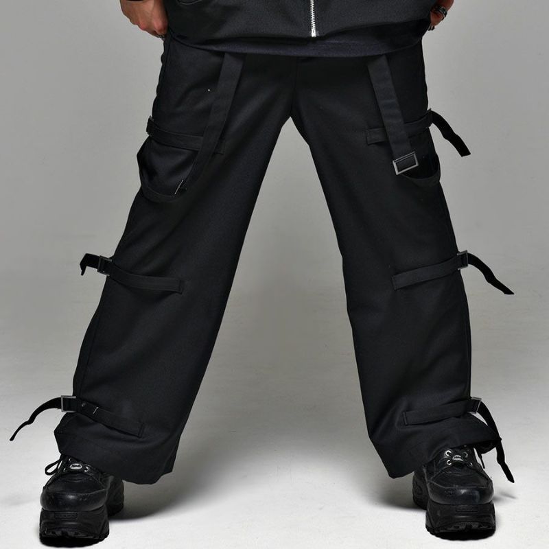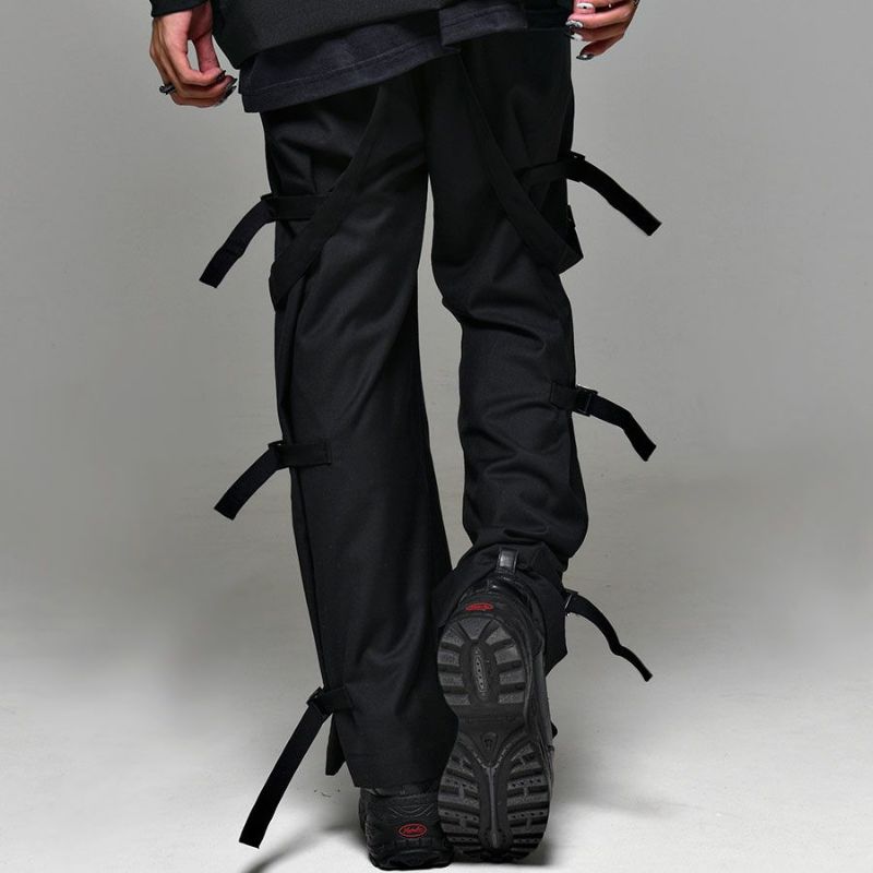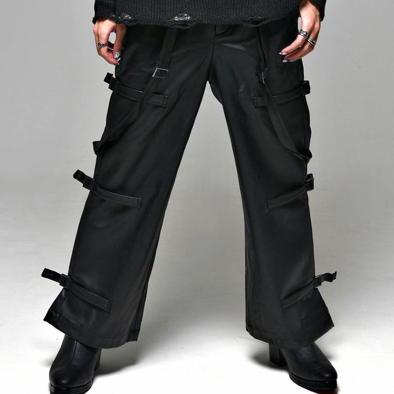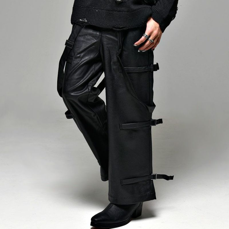 サスペンダー付きのベルトデザインワイドパンツとなり
