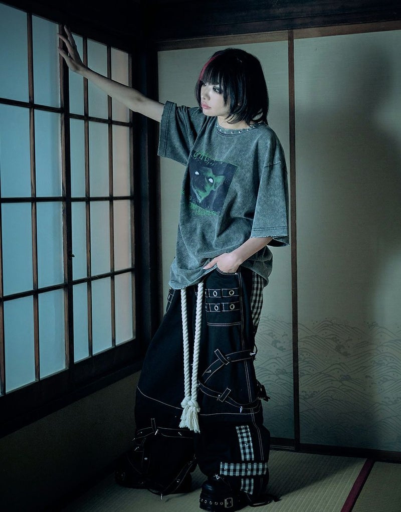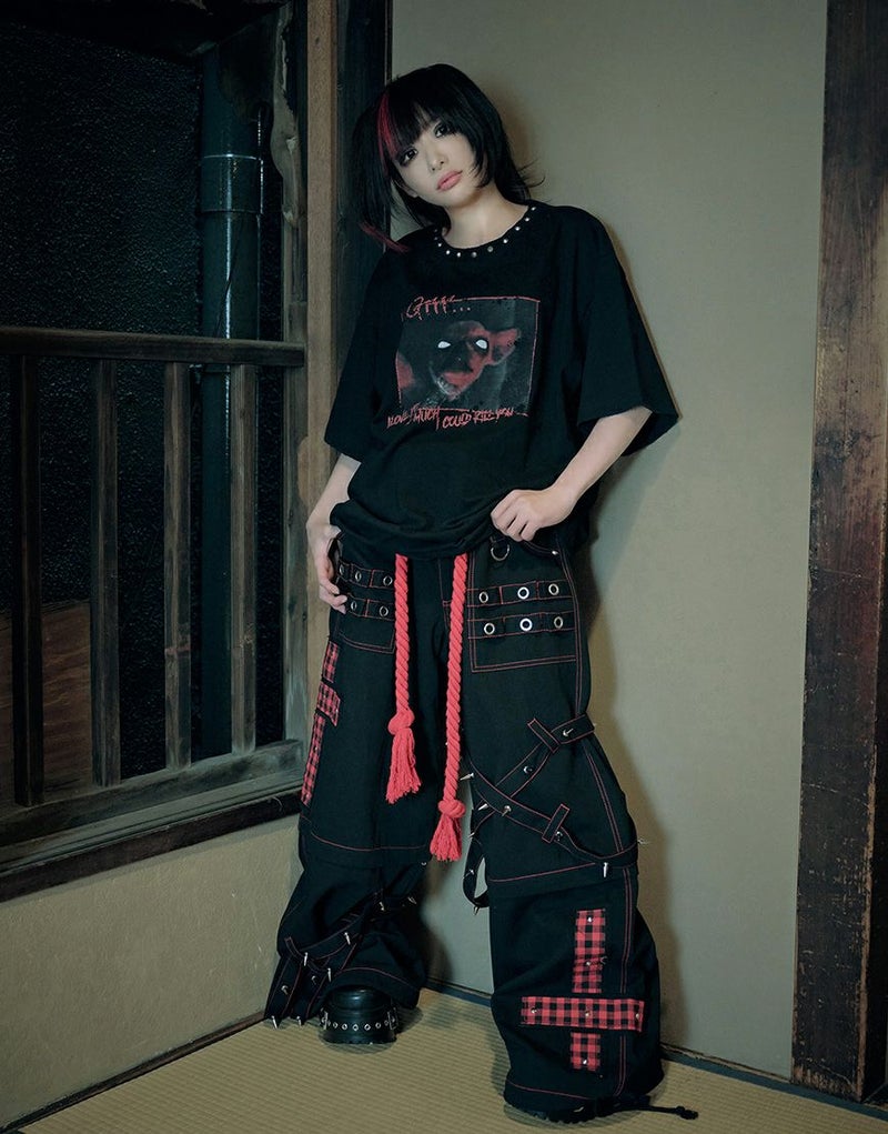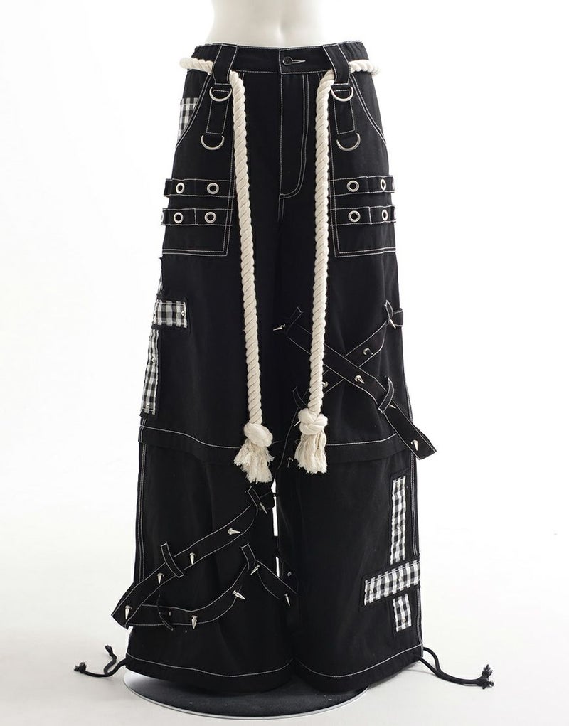 アシンメトリーに配置されたスタッズベルト、チェック柄のクロスが目を引き、
