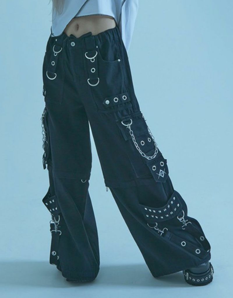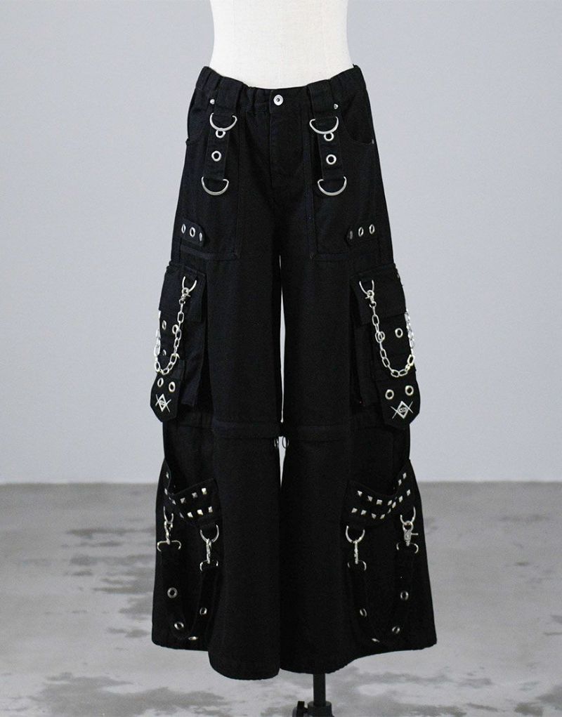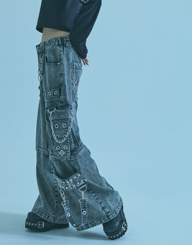 綿100%のブラックデニム素材を使用したボンテージワイドカーゴパンツです。