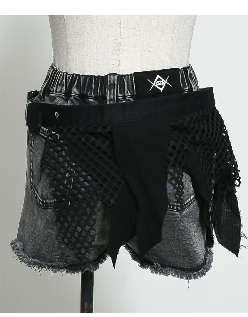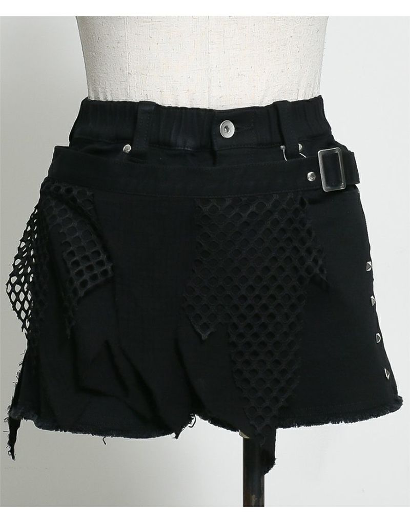 ストレッチ混のブラックデニム素材を使用したショートパンツとグランジテイストのデザインを施したベルトの2Pセットです。