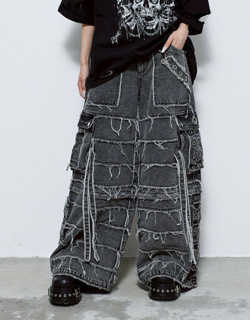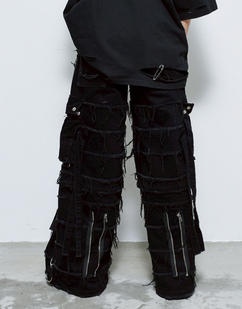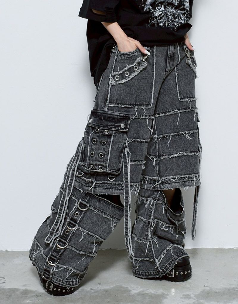 大胆な切替とほつれ加工で仕上げた、ドッキングデザインのギミックデニムパンツ。