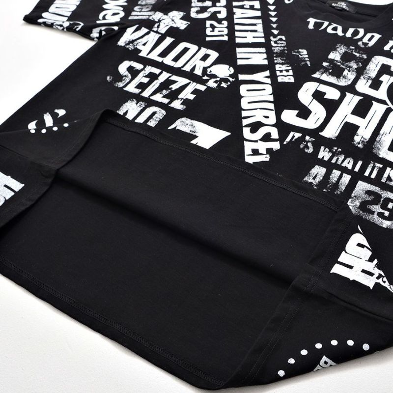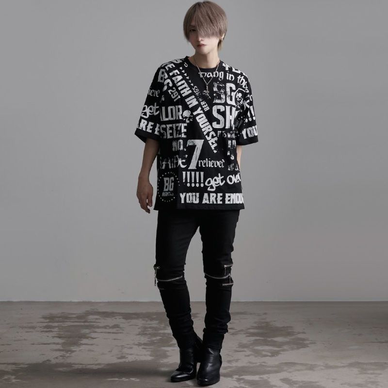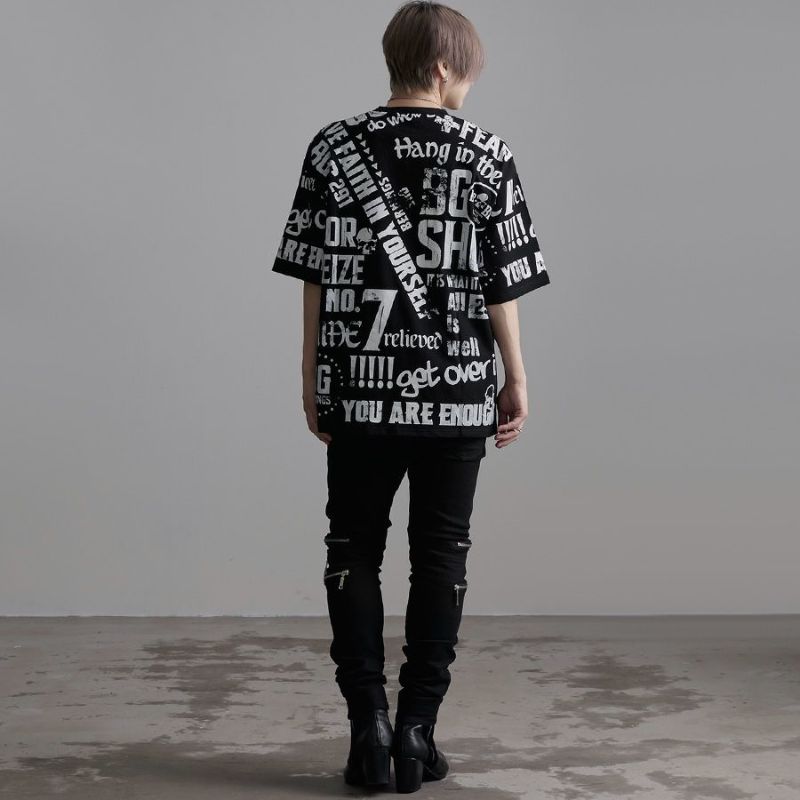 かすれたようなグランジテイストのテキストがフロント、バック全面にプリントされた半袖Tシャツです。