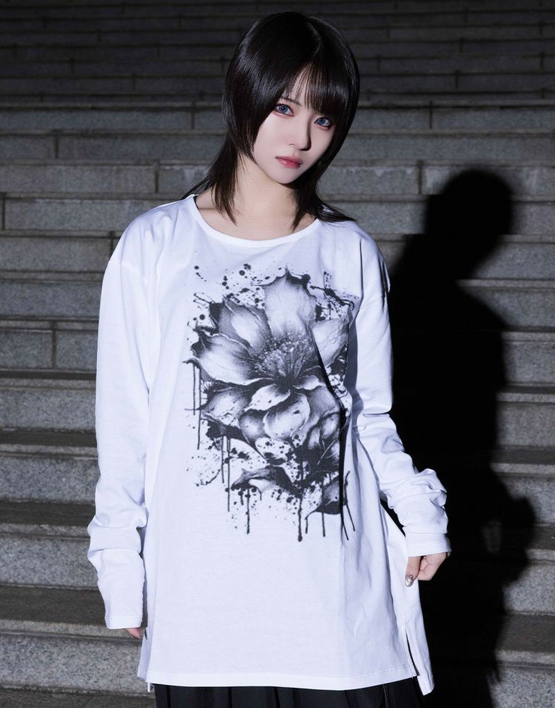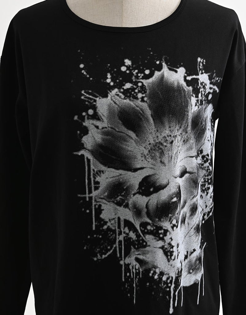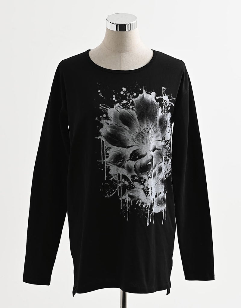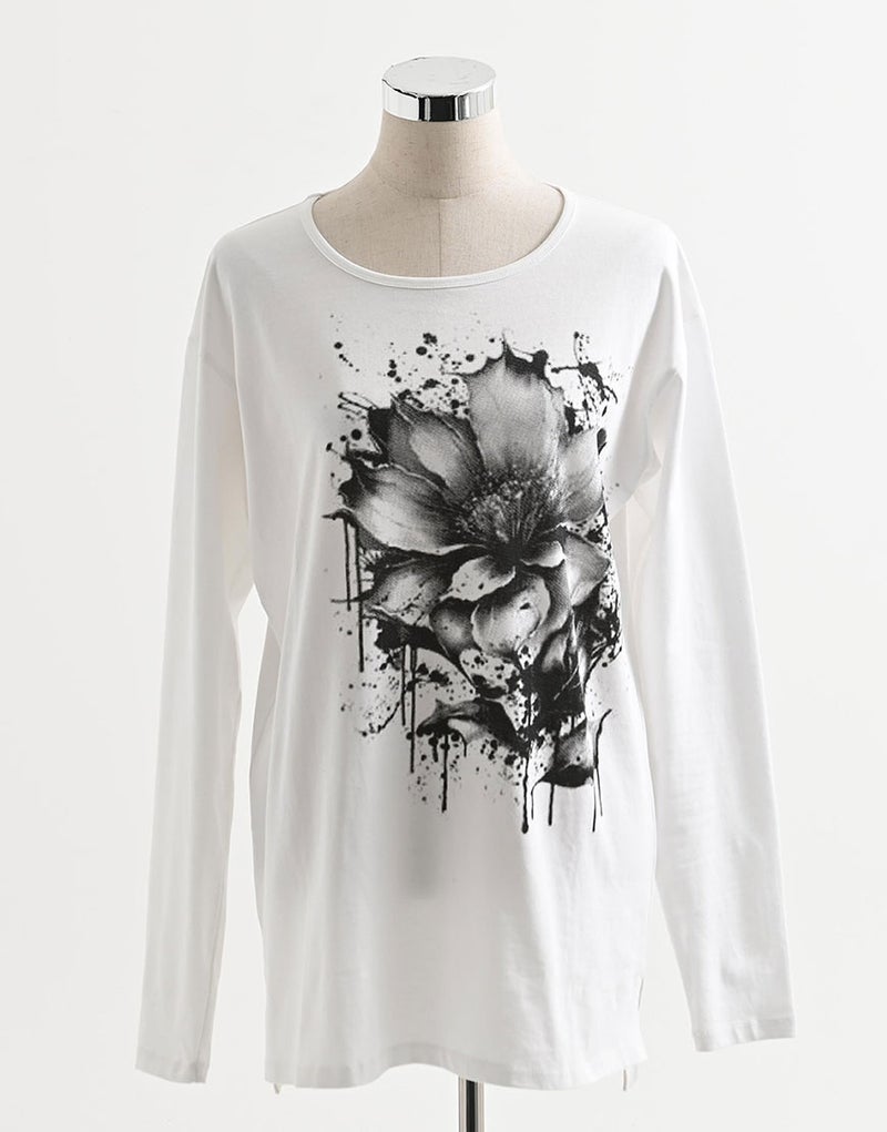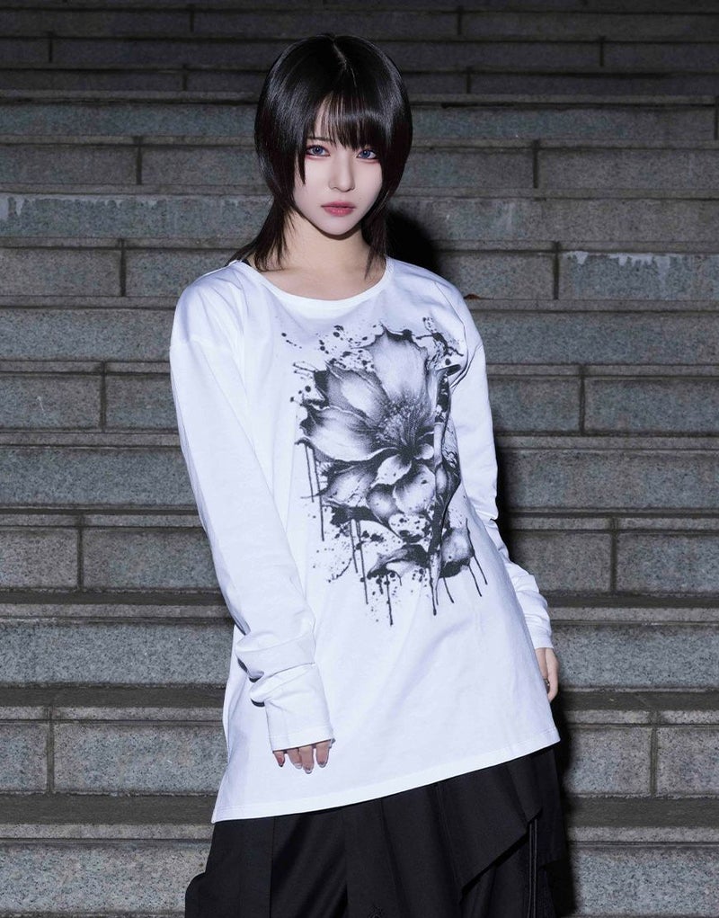 水墨画調のフラワーアートを大胆に落とし込んだ、存在感のあるロングスリーブTシャツ。