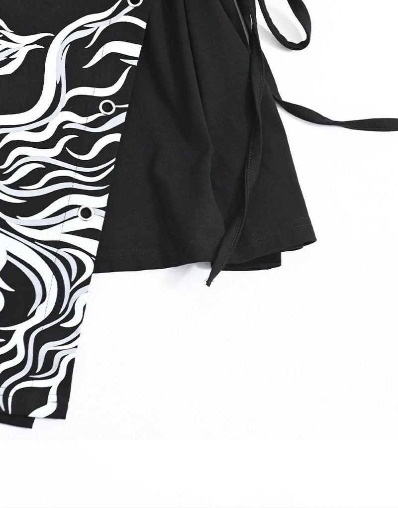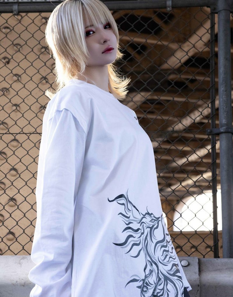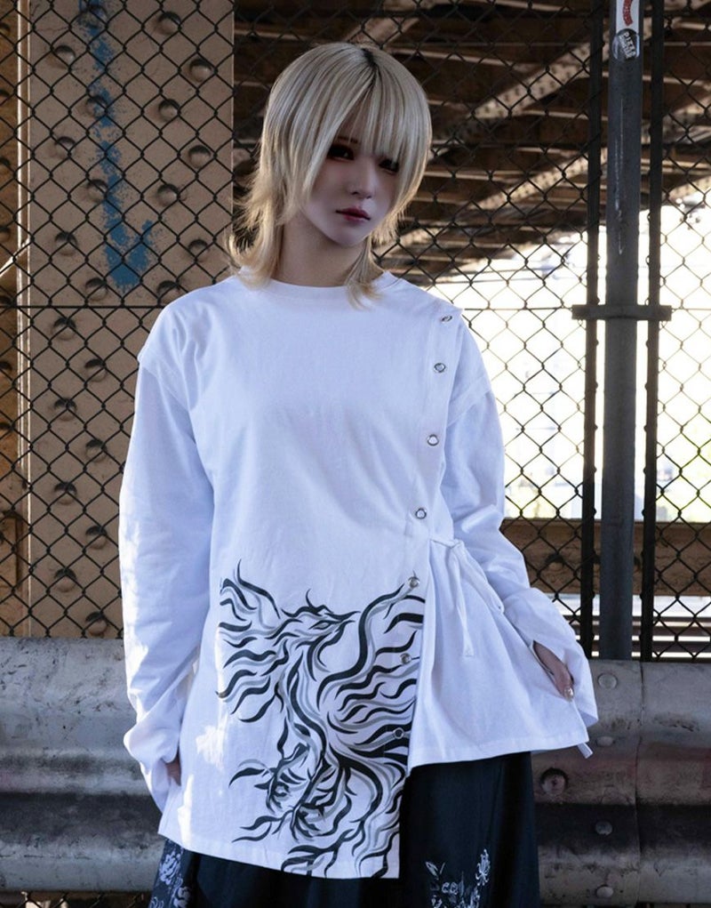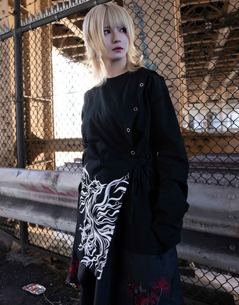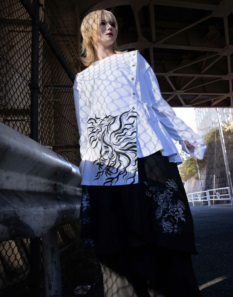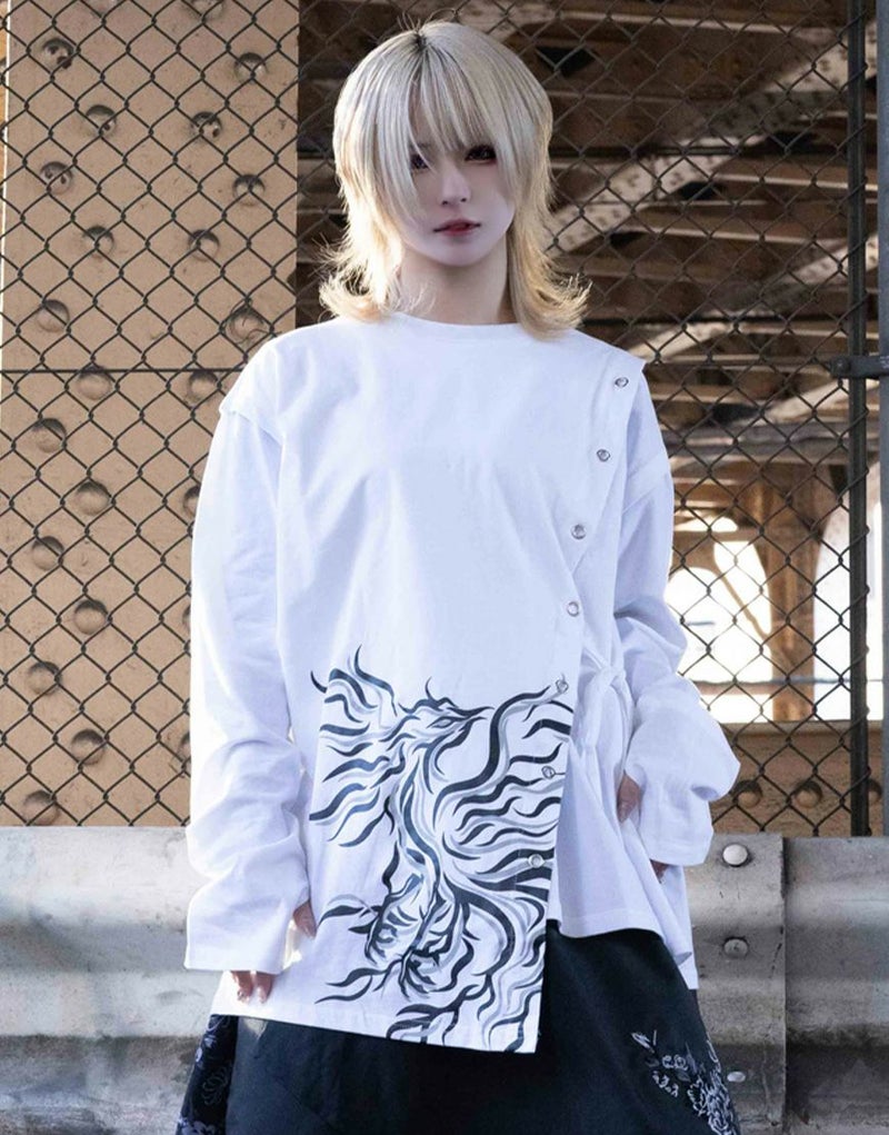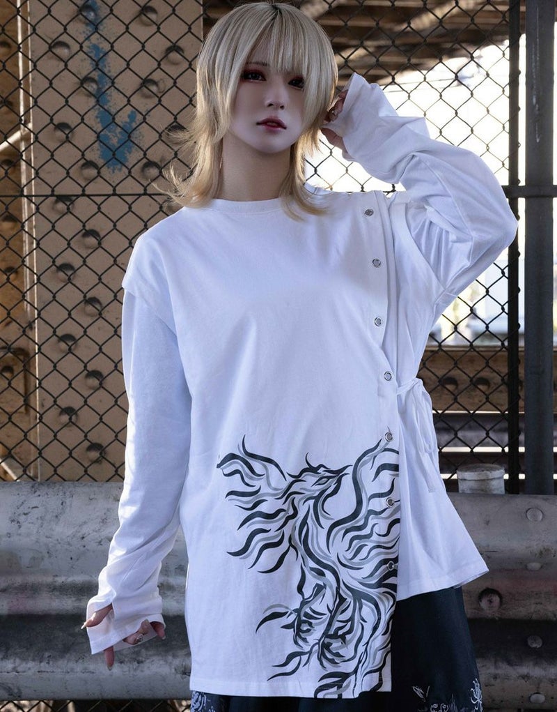 朱雀をモチーフにした力強いアートワークを、アシンメトリー構造で表現したロングスリーブカットソー。