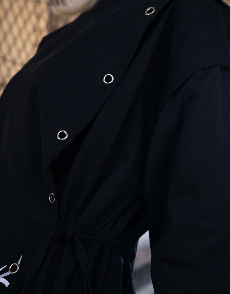 脇部分には内掛け紐を備え、レイヤードのニュアンスを調整可能。