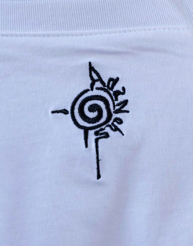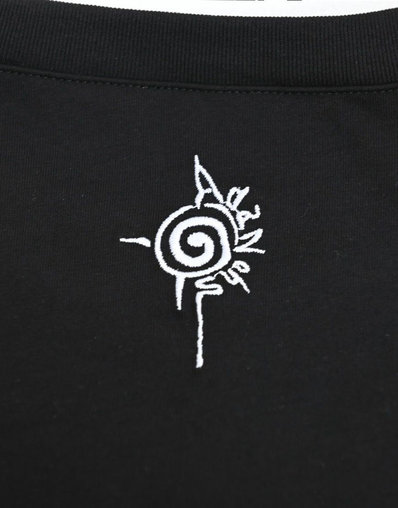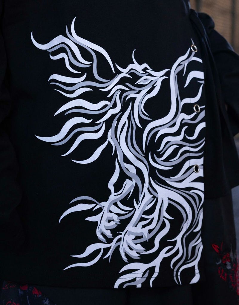 前身頃には炎を纏う朱雀を大胆にプリントし、後身頃にはブランドロゴ刺繍を配置。