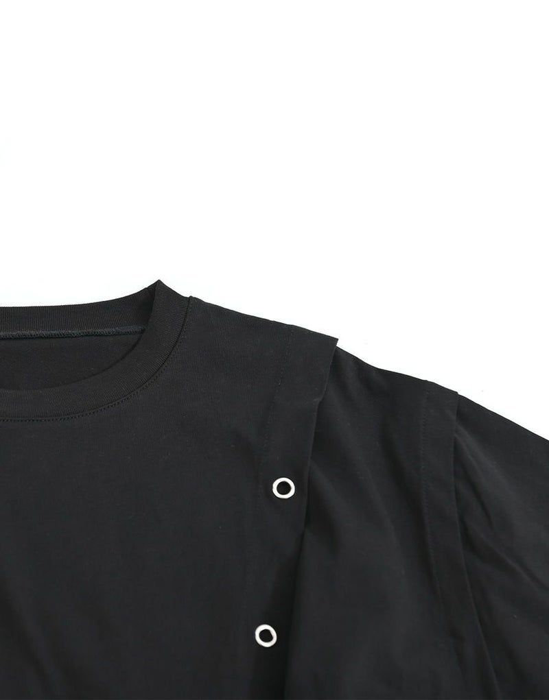 レイヤード部分にはアイレットを施し、無機質さと装飾性を兼ね備えたディテールに。