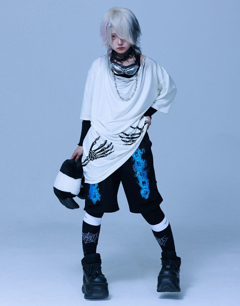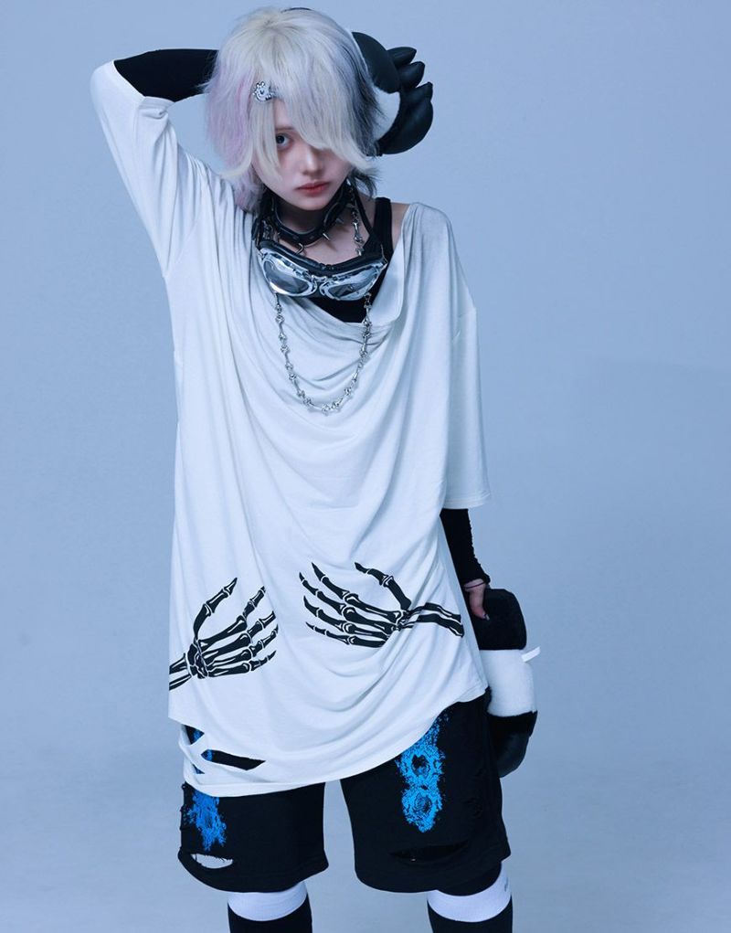《ボクは骨になるまでゆるりと生きるつもりです手骨ドレープTEE》は、両サイドから前後にかけてプリントされた“腕の骨”が印象的。