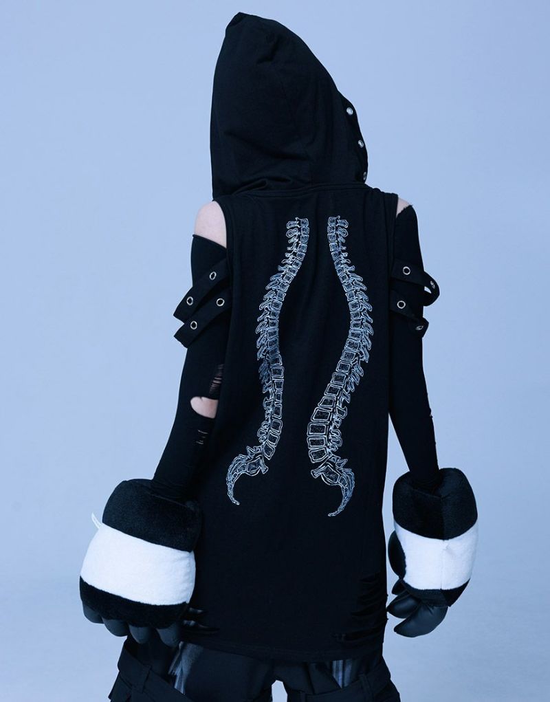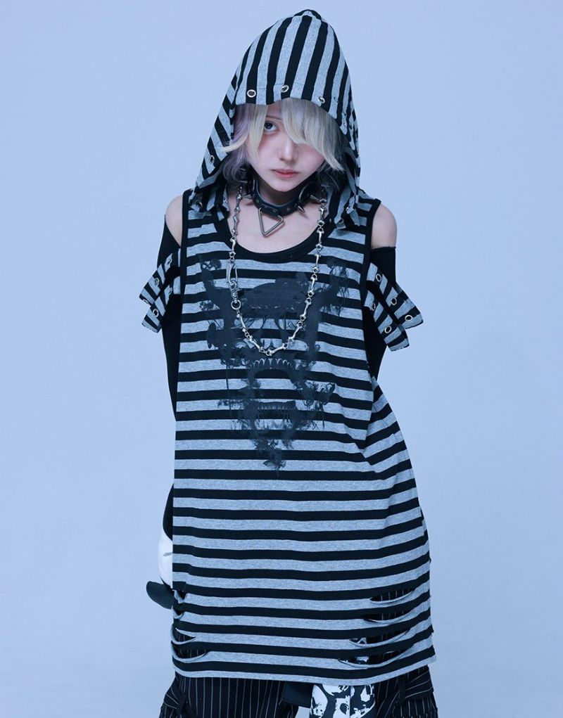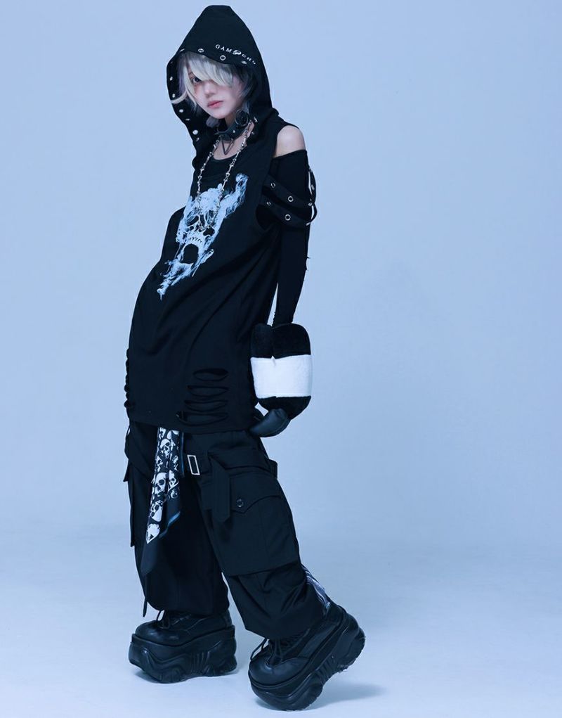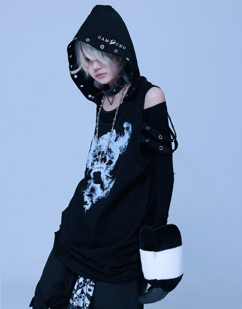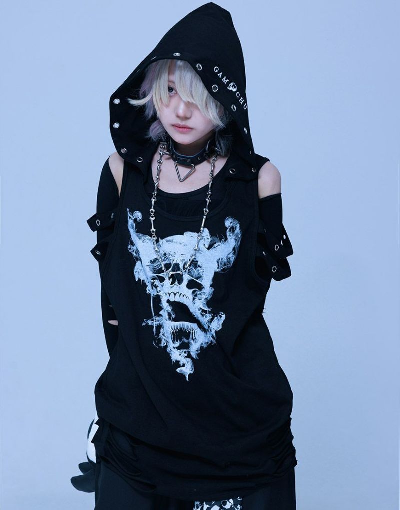 Gamchuが放つ、《ボクはずっと日陰にいたいなフード付きスカルタンクトップ》は、定番という概念を裏切る“破壊された美”を宿す一枚。