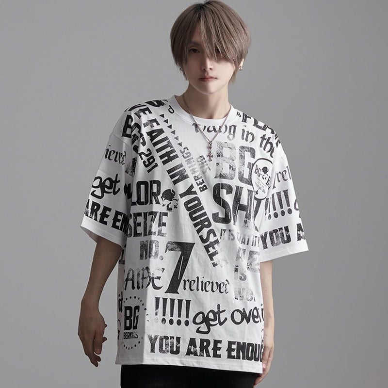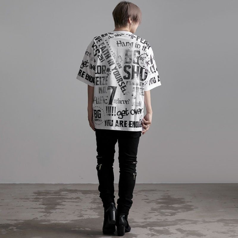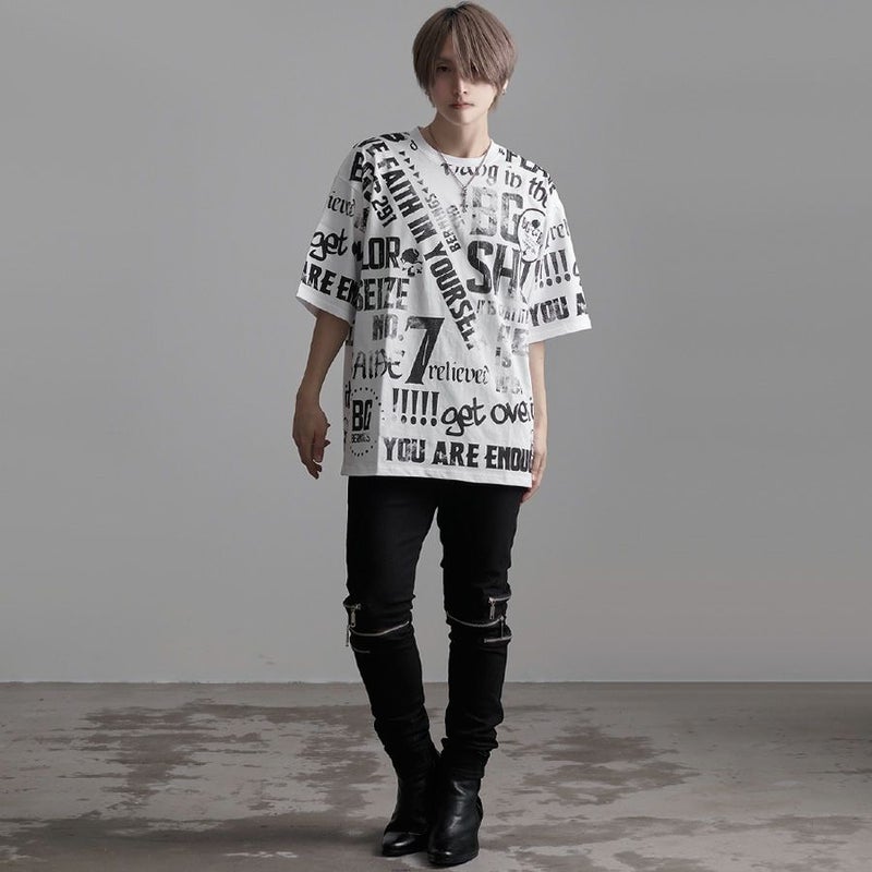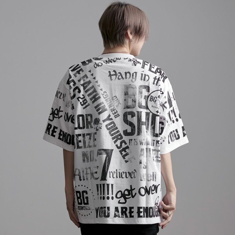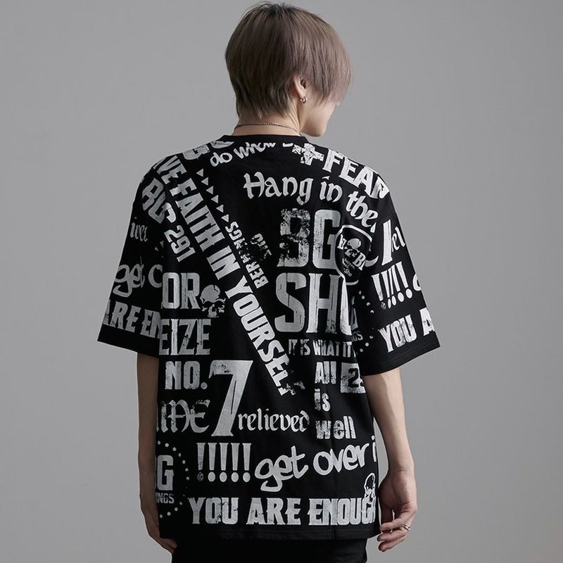 かすれたようなグランジテイストのテキストがフロント、バック全面にプリントされた半袖Tシャツです。