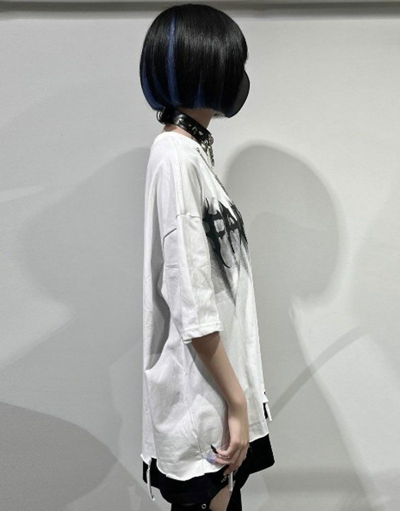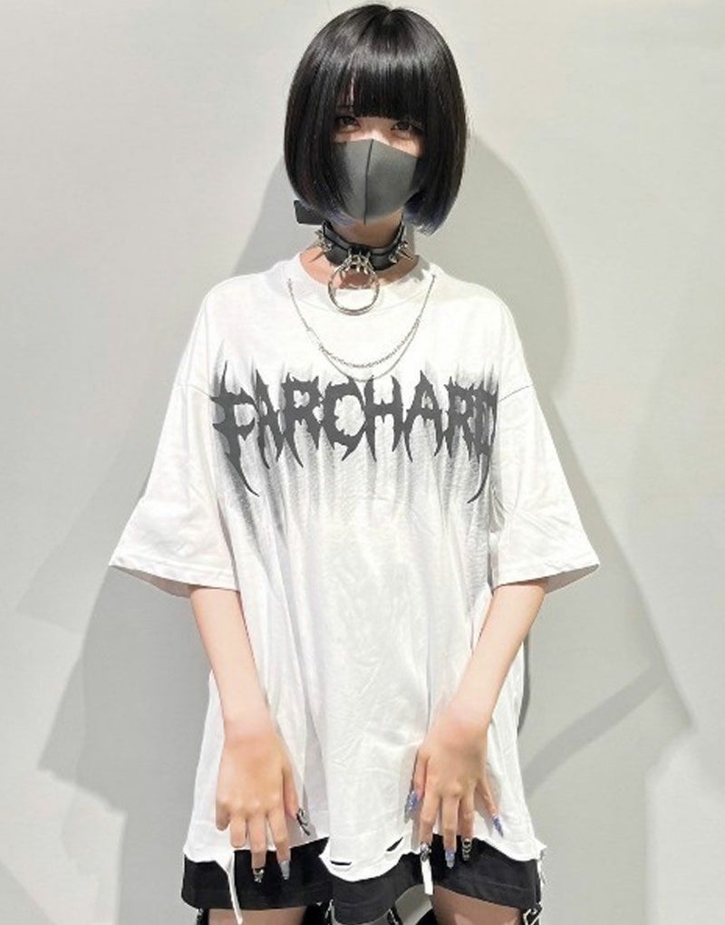 1枚でレイヤードスタイルが楽しめ裾のブロークン加工、メタル調のロゴプリントがロックスタイルを演出します。