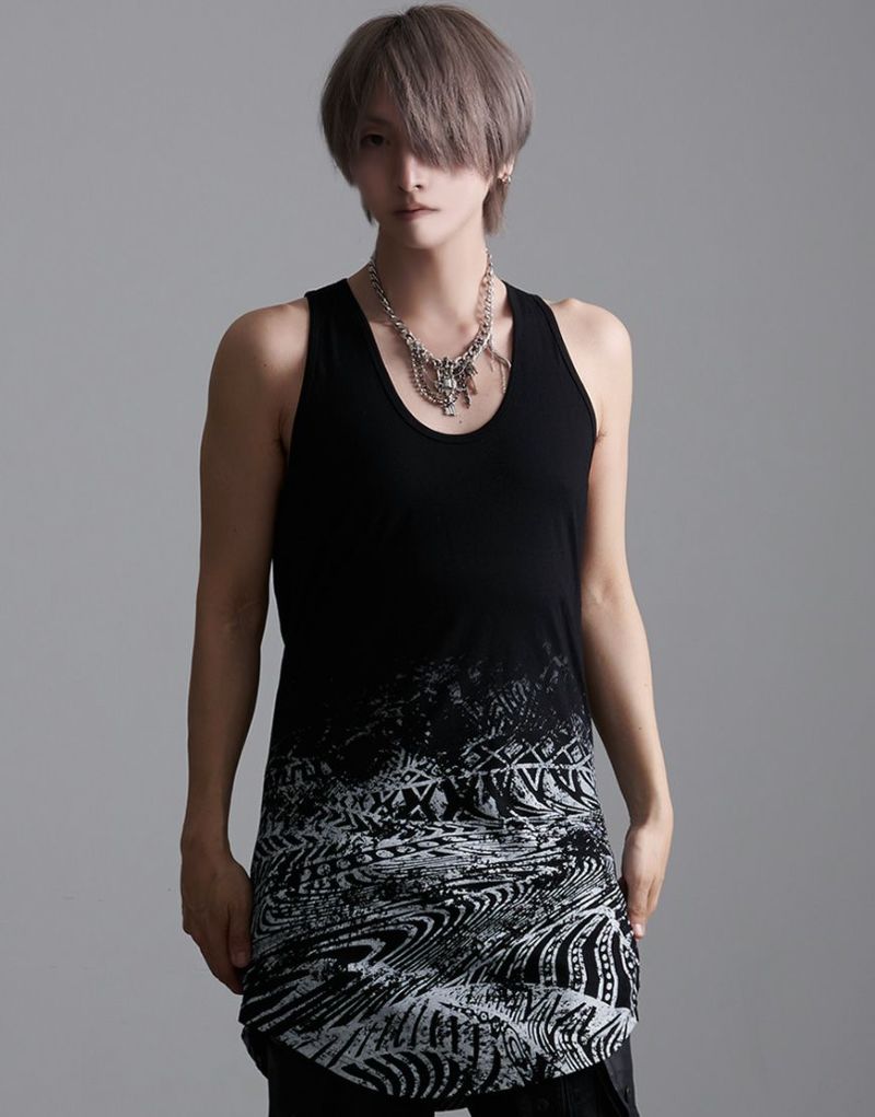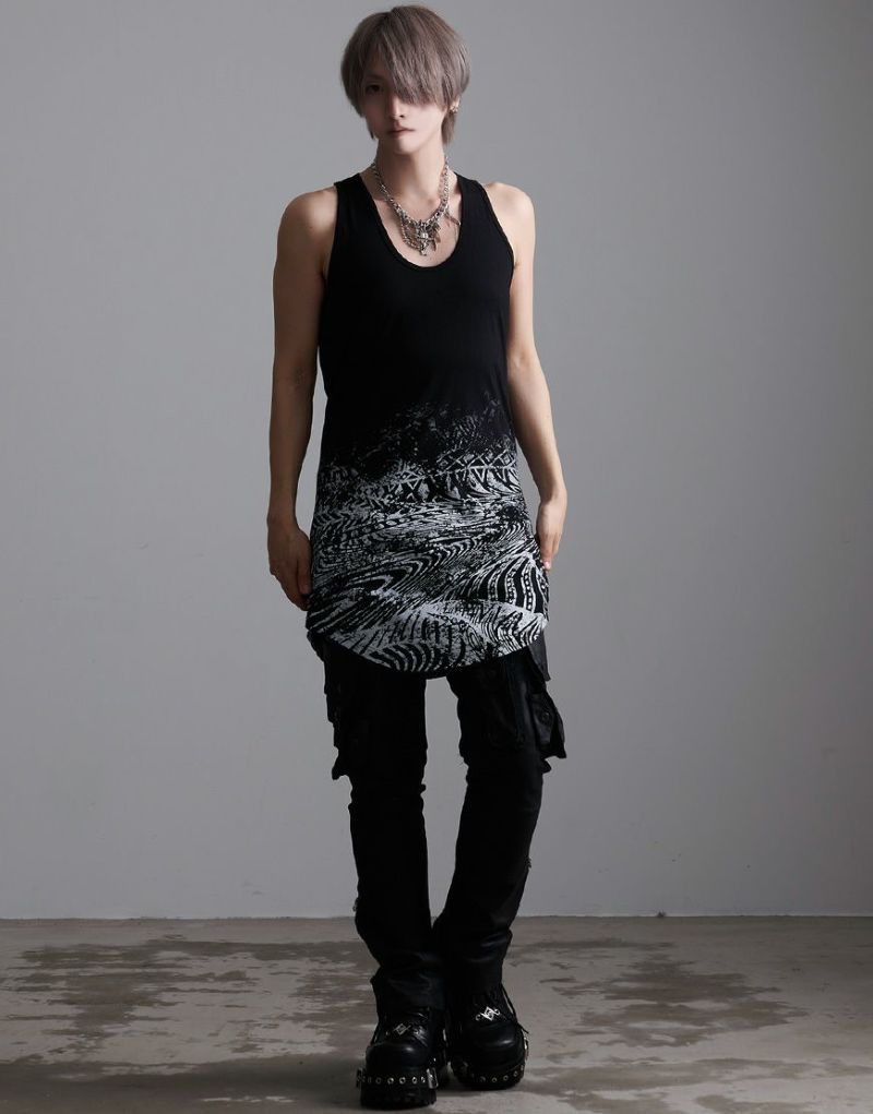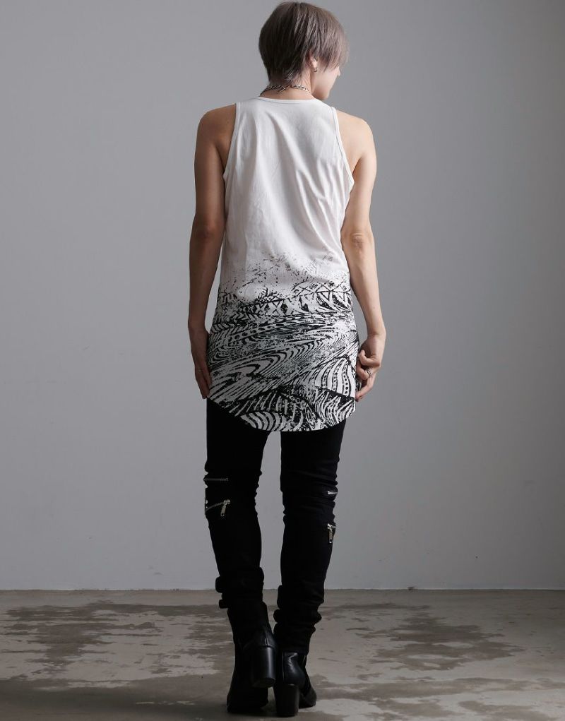 モノトーンカラーで煙グラフィックを裾からグラデーションのようにクラックさせながらプリントしたラウンドシルエットのロングタンクです。