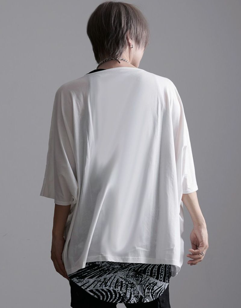 少しネックを横に広めにとった襟元のドルマンシルエットポンチョTシャツ。
