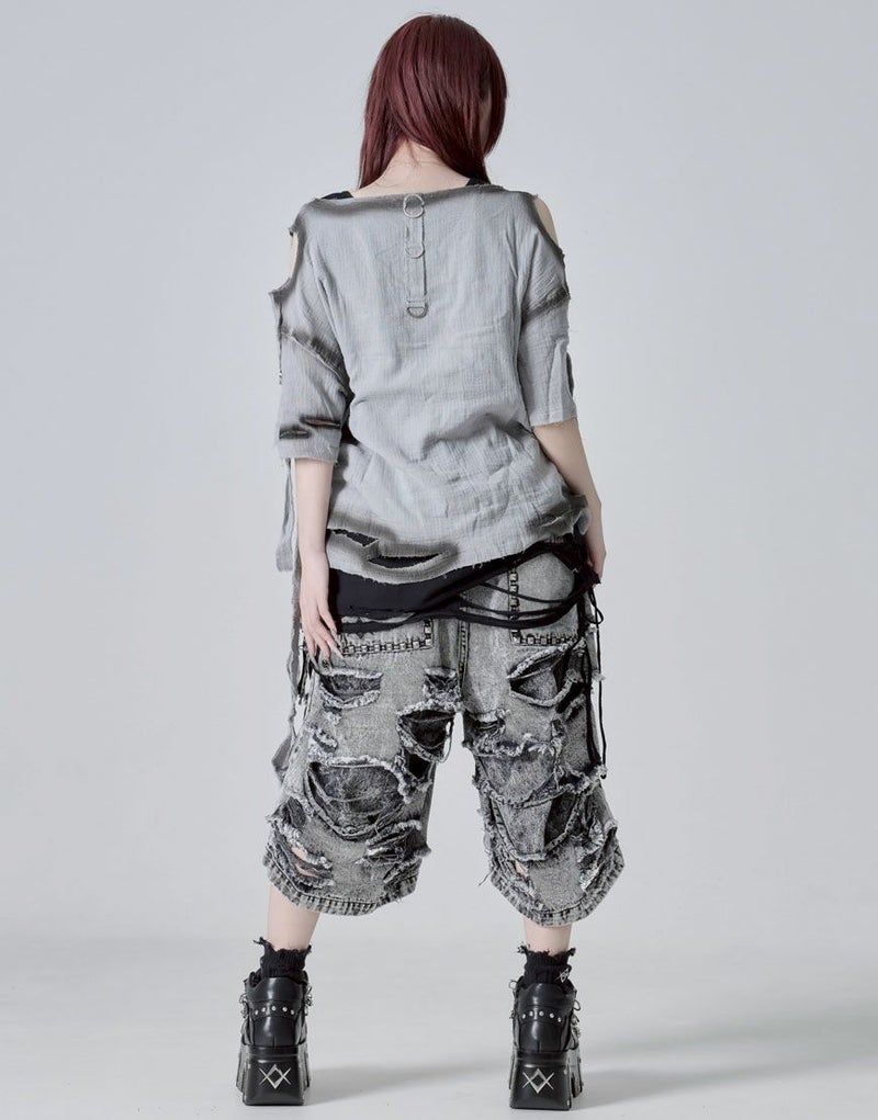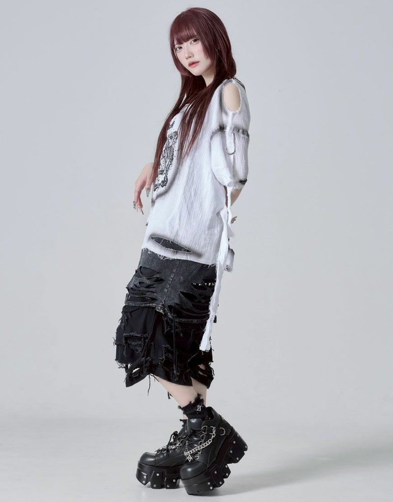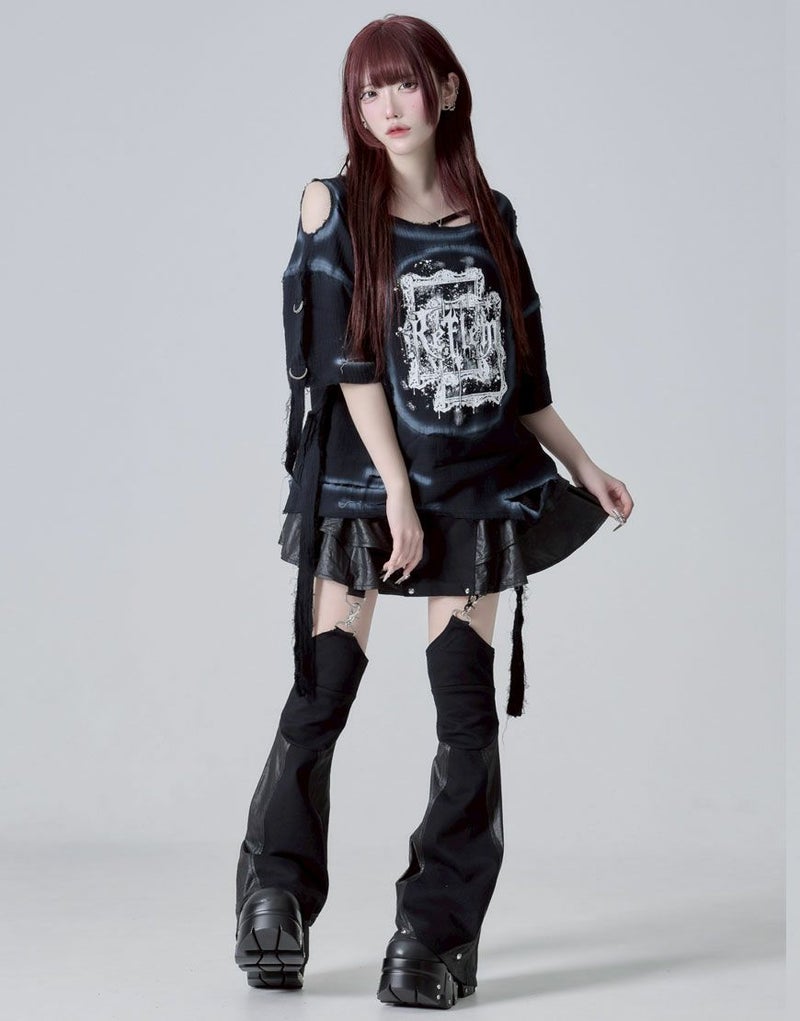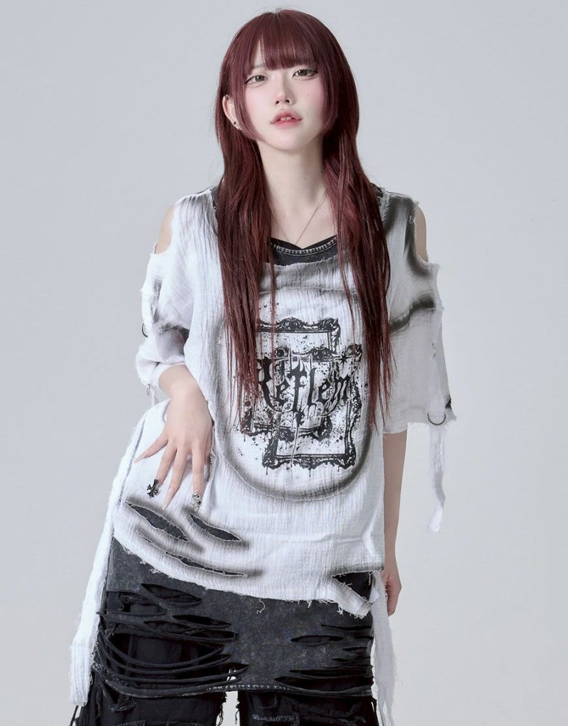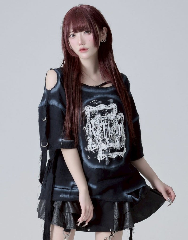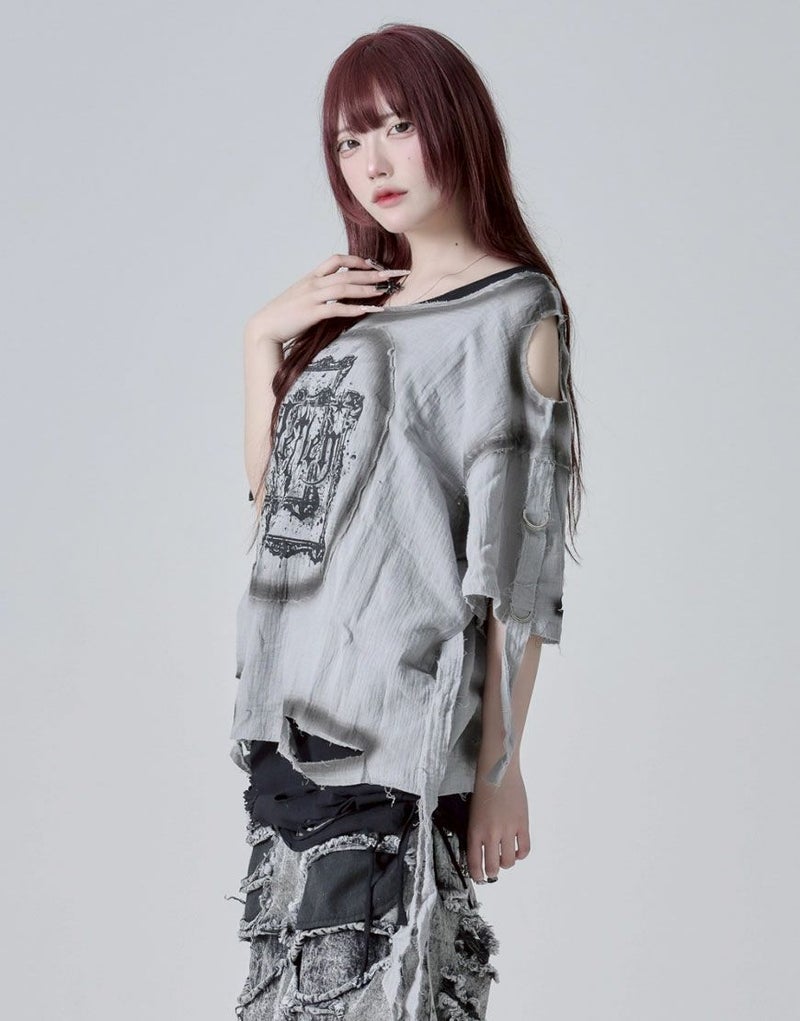 グラフィックはプリント仕様、ボディ部分には部分ダメージ加工&スプレー加工でグランジな雰囲気を引き立てます。