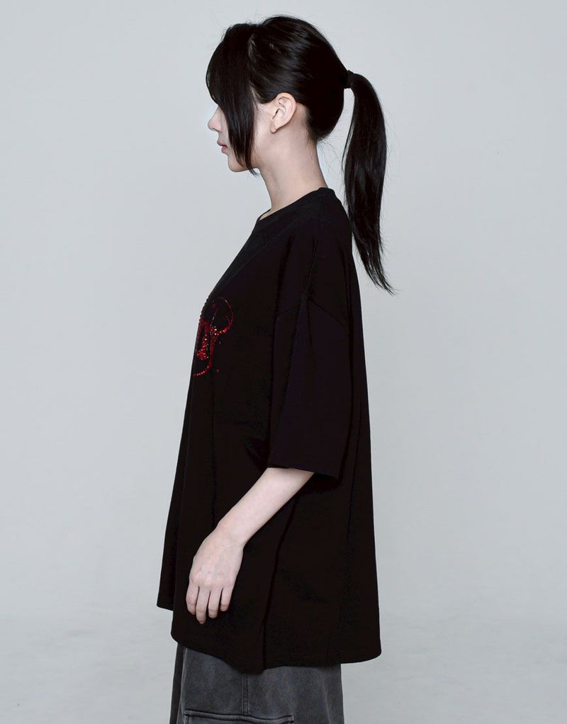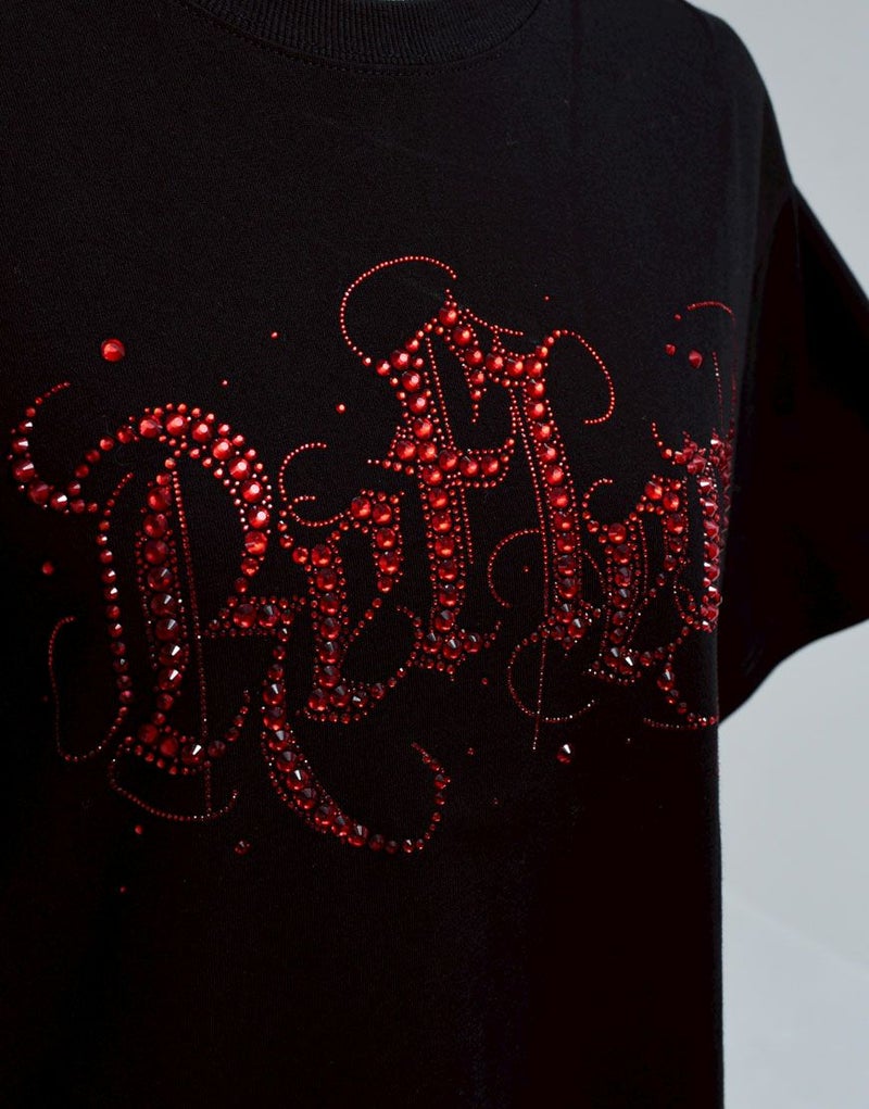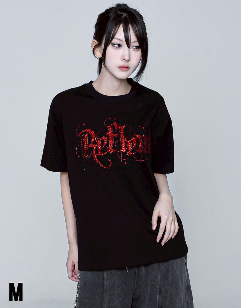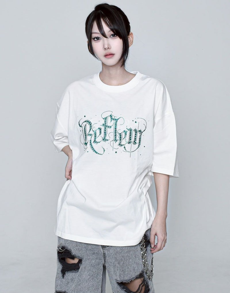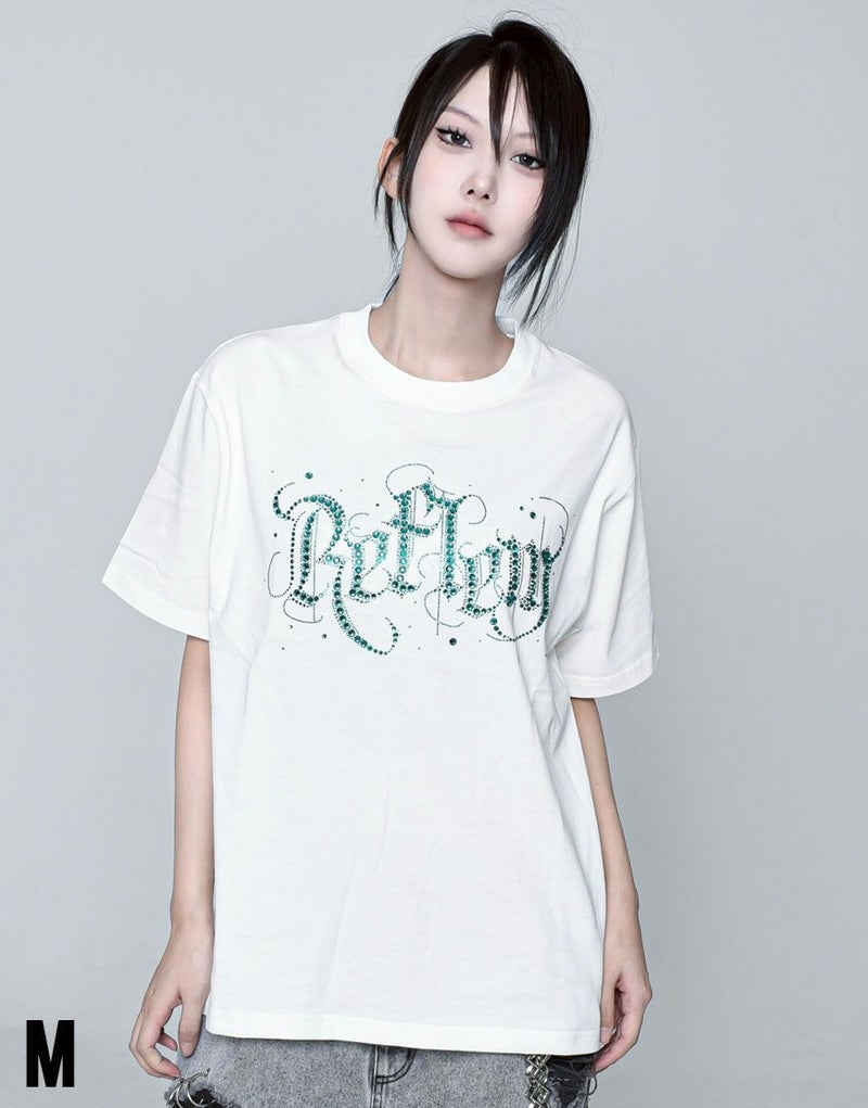 大小さまざまなラインストーンと使用してロゴをデザインの半袖トップスです。