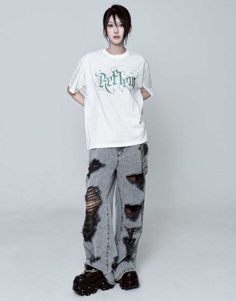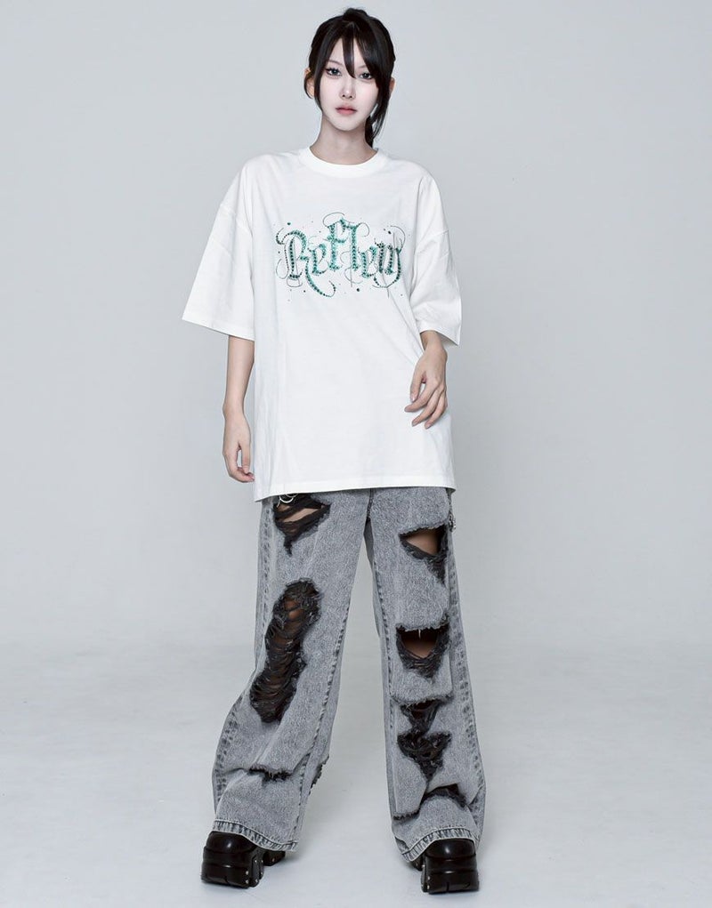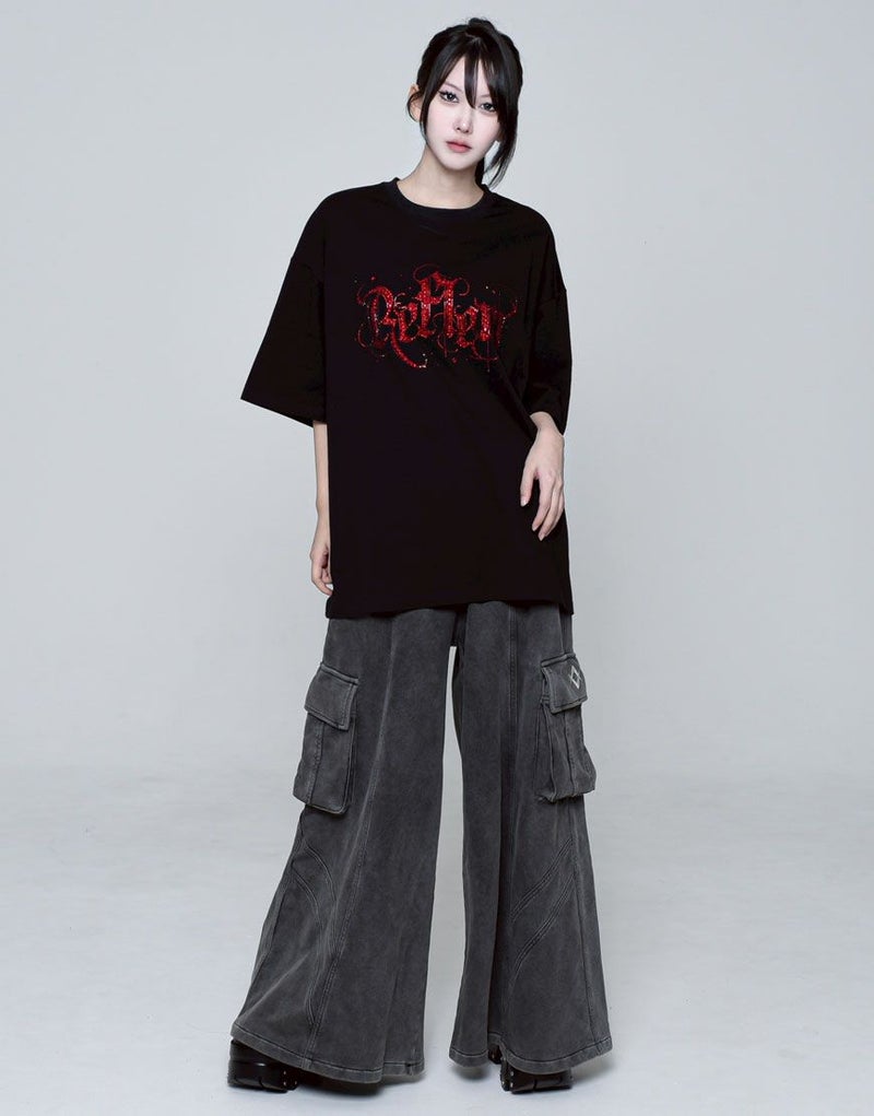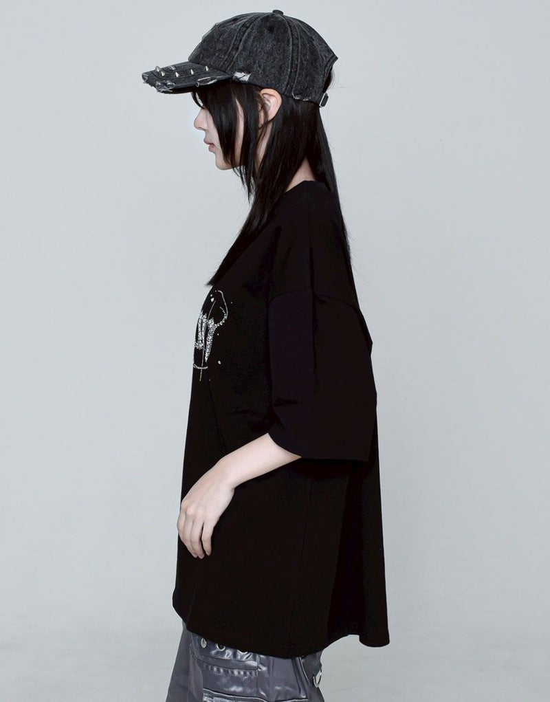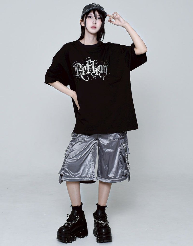 大小さまざまなラインストーンと使用してロゴをデザインの半袖トップスです。