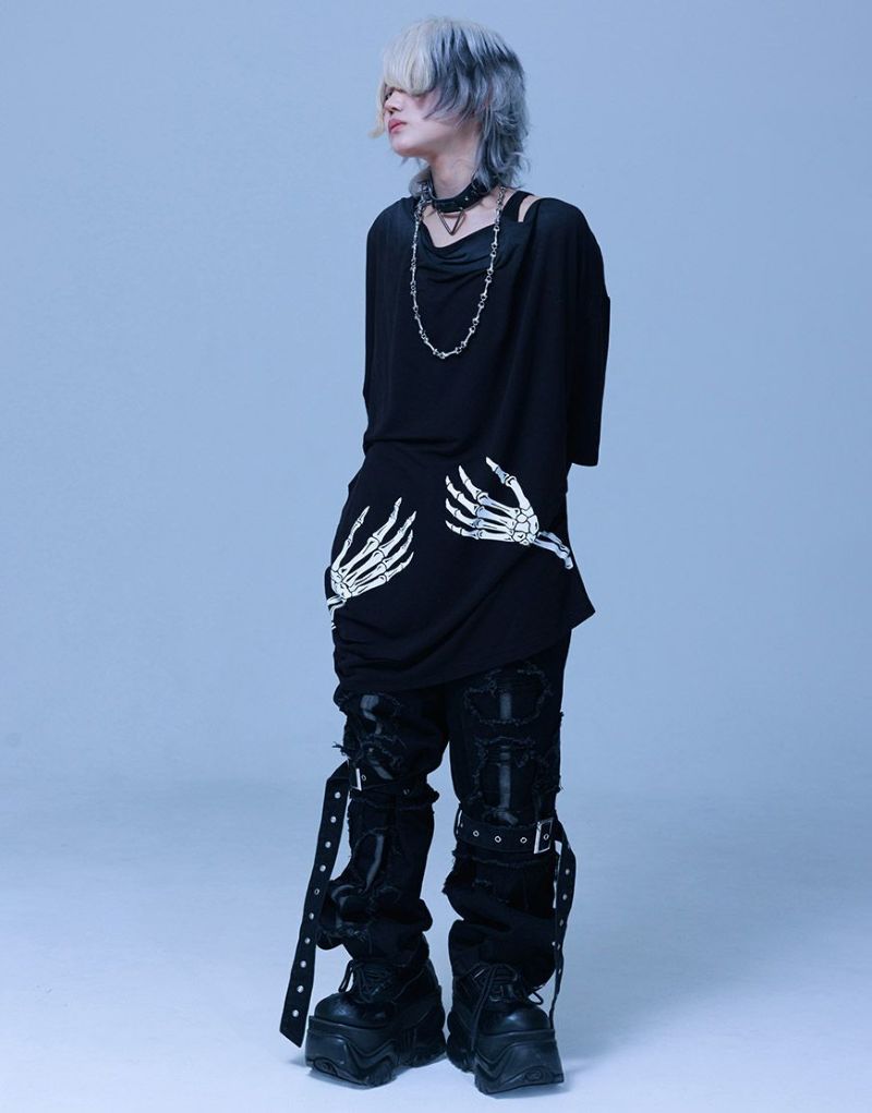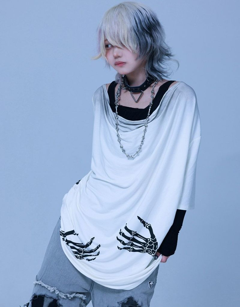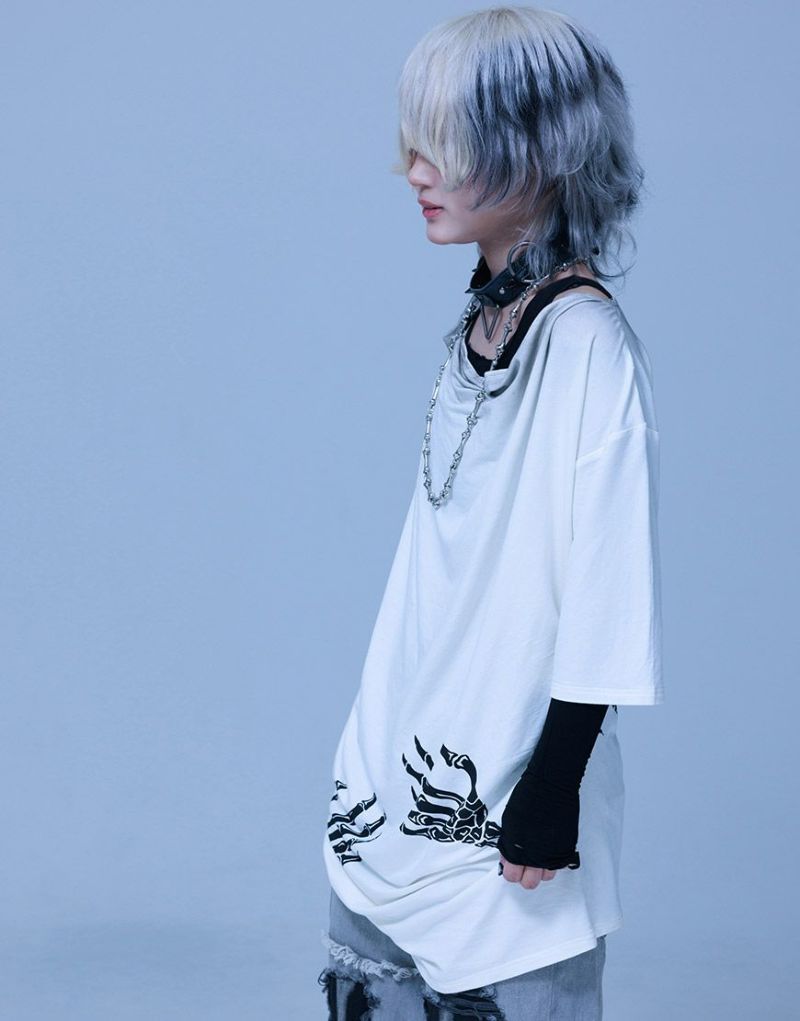 《ボクは骨になるまでゆるりと生きるつもりです手骨ドレープTEE》は、両サイドから前後にかけてプリントされた“腕の骨”が印象的。