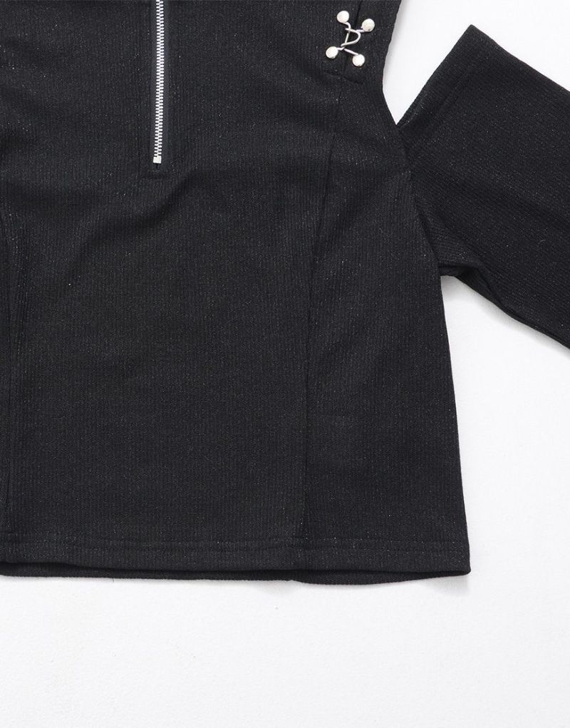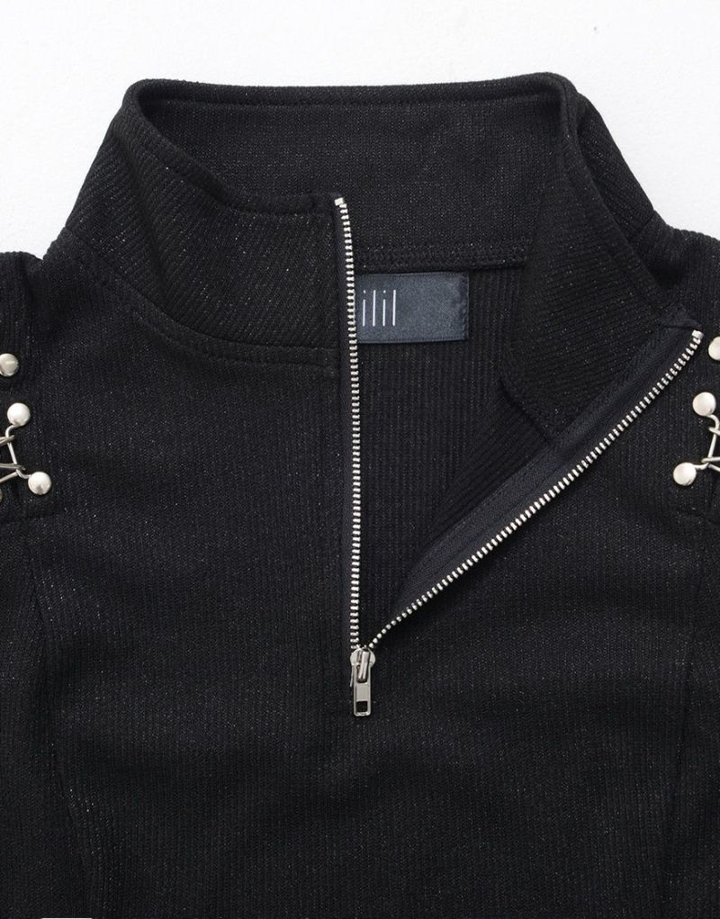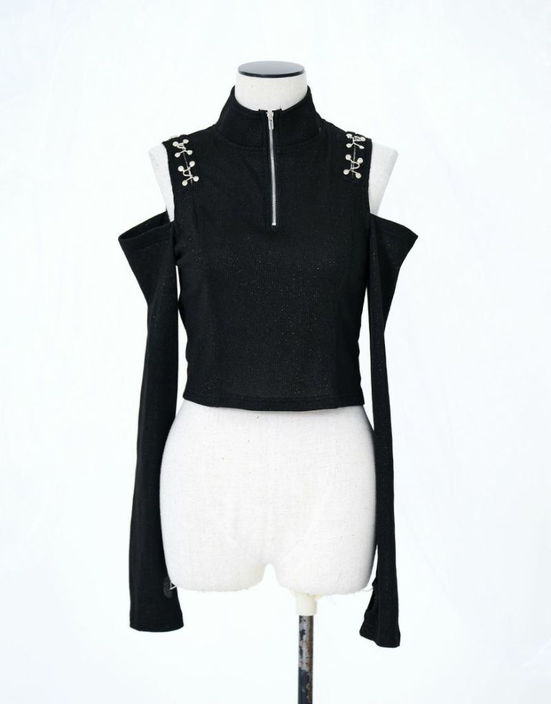 ililil【イルイルイル】より地雷ちゃんの万能★クロップド肩開きキラキラリブドハーフジップ長袖カットソーが登場です。 肩にホック付きのスリットが入ったクールなデザイントップス♪ ホックは鋲止め仕様で、さりげなくエッジの効いたアクセントに。 肩開きデザインが抜け感をプラスし、指ぬき付きで手元までおしゃれに◎ リブ生地は薄めで、ラメが入った上品な輝きが魅力 軽やかな着心地で、春先から初夏ごろまでロングシーズン活躍する一枚です♪ 同時発売の【IL25-C02】 【IL25-E05】 と合わせて着用することでセットアップ提案も楽しめます。