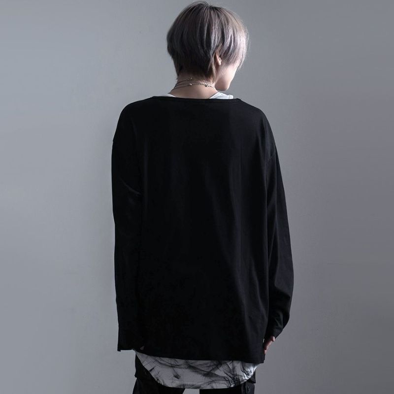 少しネックを横に広めにとったボートネックの長袖Tシャツ。