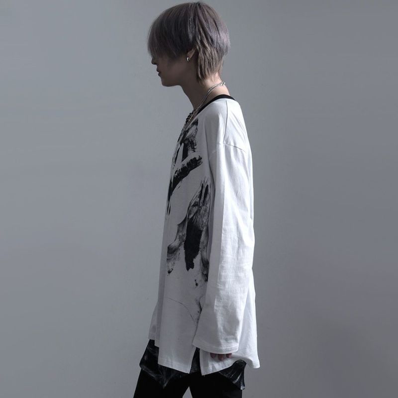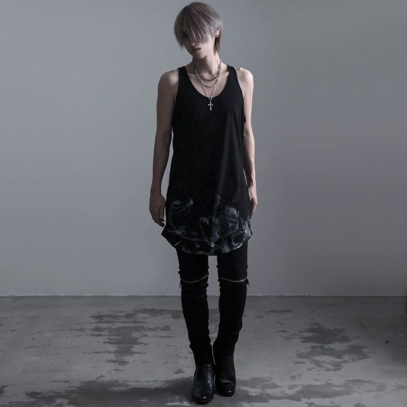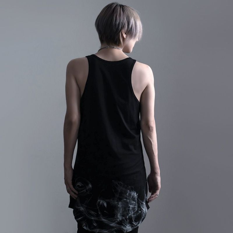 モノトーンカラーで煙グラフィックを裾からグラデーションのようにクラックさせながらプリントしたラウンドシルエットのロングタンクです。