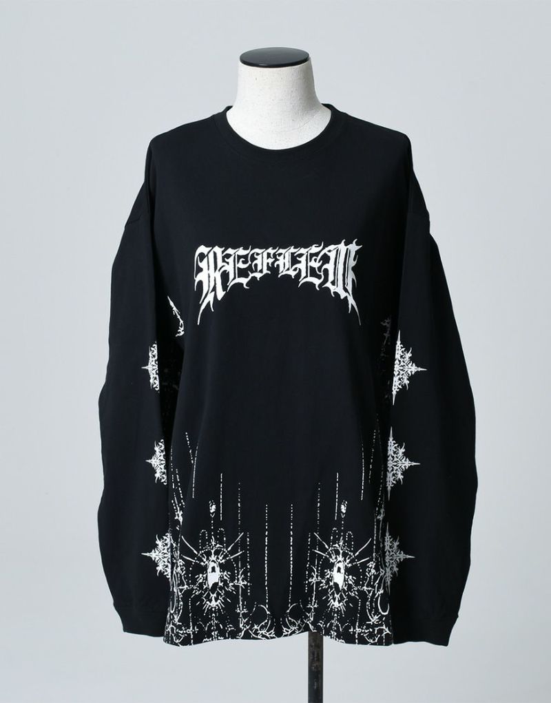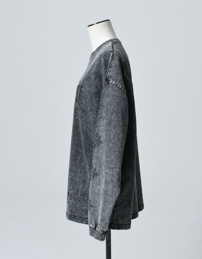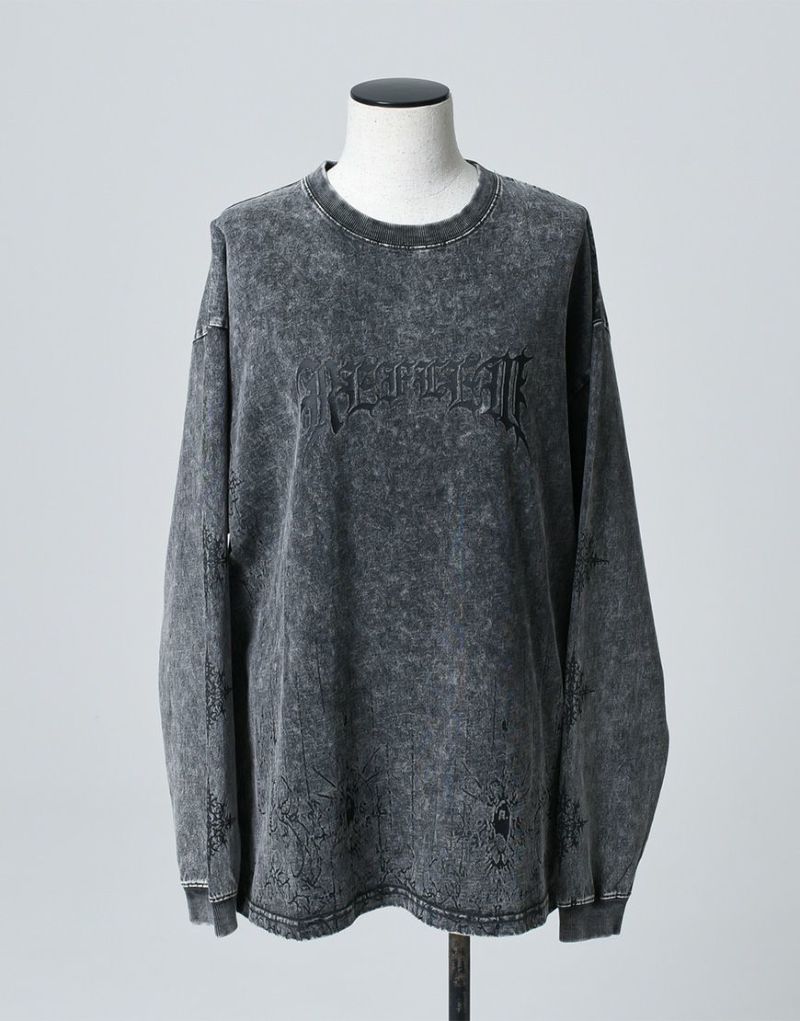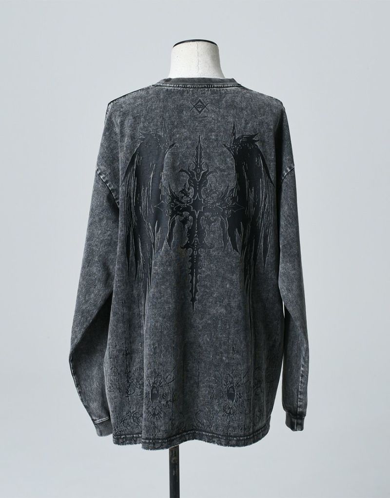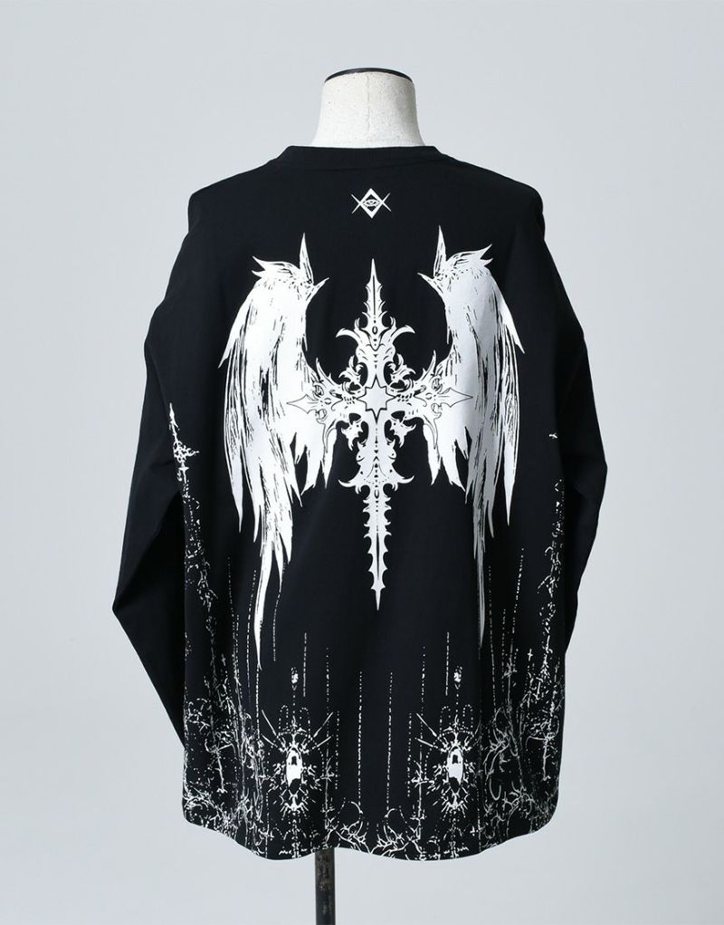 フロント、バック、袖にロゴやゴシックテイストのクロス、翼のプリントでダークな雰囲気を演出したインパクトある長袖Tシャツです。