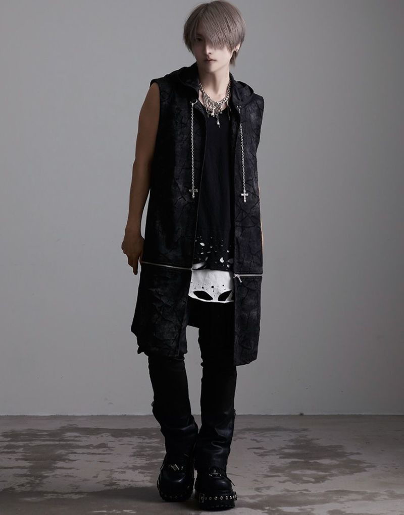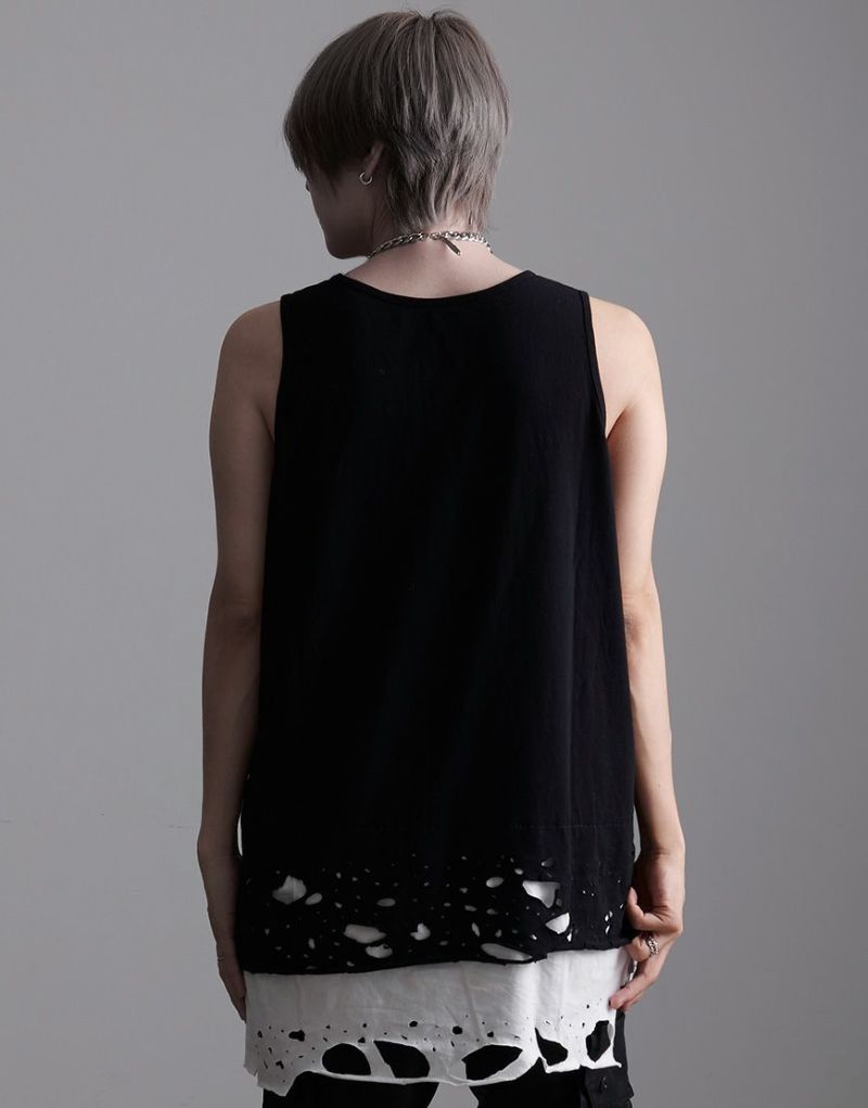 裾のレイヤード部分にオパール加工によるダメージを施したオーバーサイズのロングタンクです。