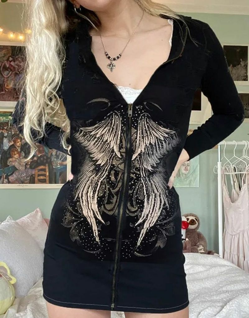 NOVESSEL【ノベセル】からフード付きプリントジップアップ長袖カットソーが入荷しました。 Tシャツ生地にフード付きの細身シルエットのカットパーカー。 カットワンピースデザインとインパクトある前後のプリントがギャルっぽいテイストにも合わせやすい一品です。 アクセや髪色とマッチさせて、派手めなY2Kスタイルを楽しめます。