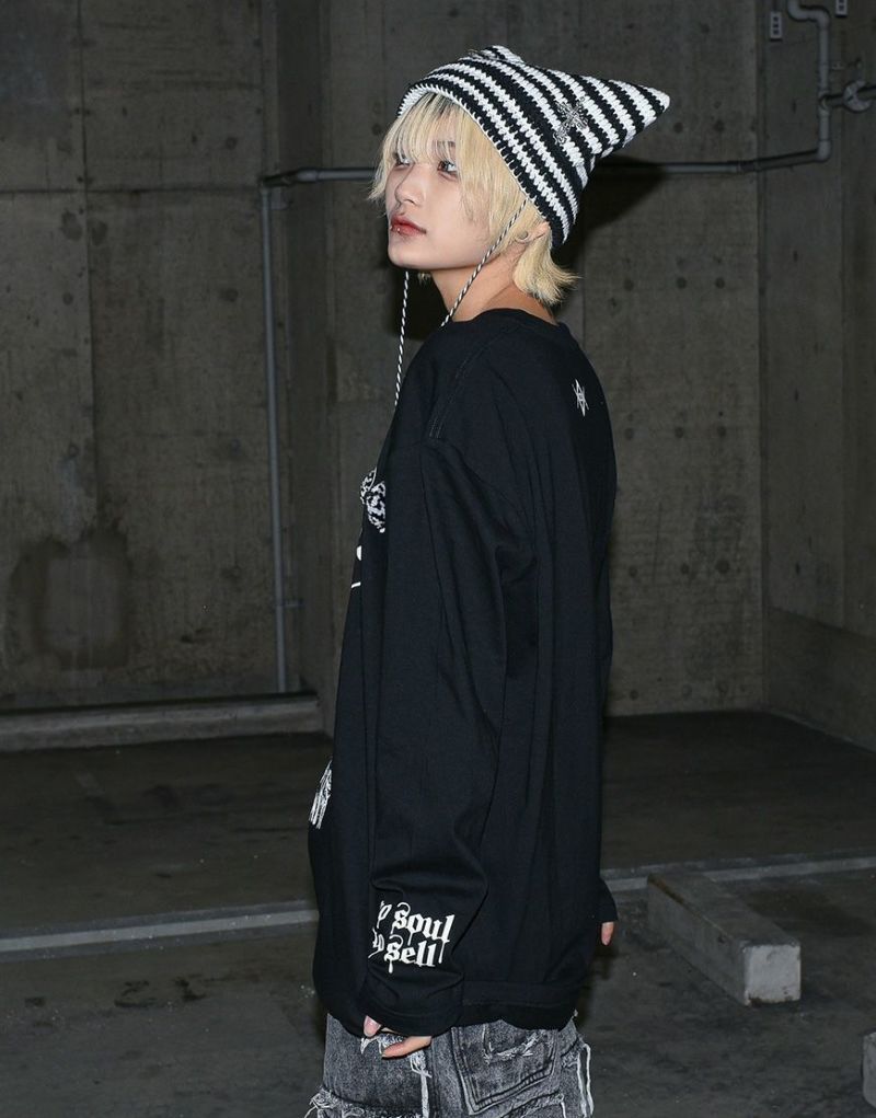 タトゥーが施された手に三日月が刺さっているという斬新なグラフィックをフロントにプリントしたビッグシルエットの長袖Tシャツ。