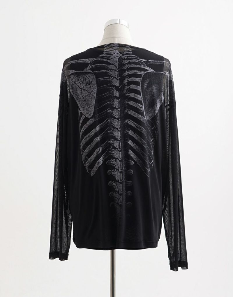メッシュトップスはフロントとバックにスケルトングラフィックを大胆にプリントし、インナーとのレイヤードで存在感を発揮します。