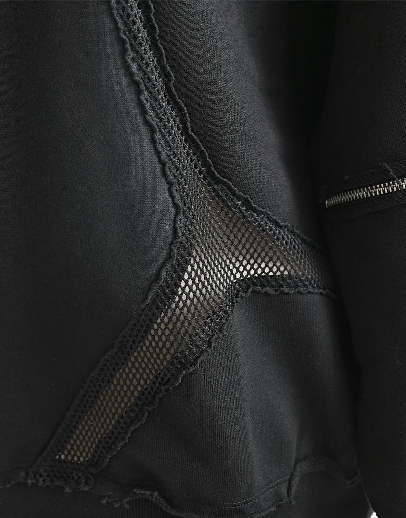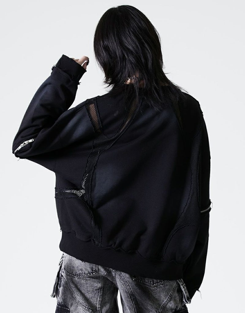 身頃から袖にかけて大胆に切り替えを入れ、メッシュを挟み込むことで立体感と近未来的なムードを演出。