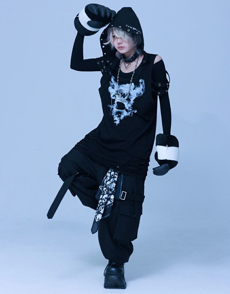 Gamchuが放つ、《ボクはずっと日陰にいたいなフード付きスカルタンクトップ》は、定番という概念を裏切る“破壊された美”を宿す一枚。