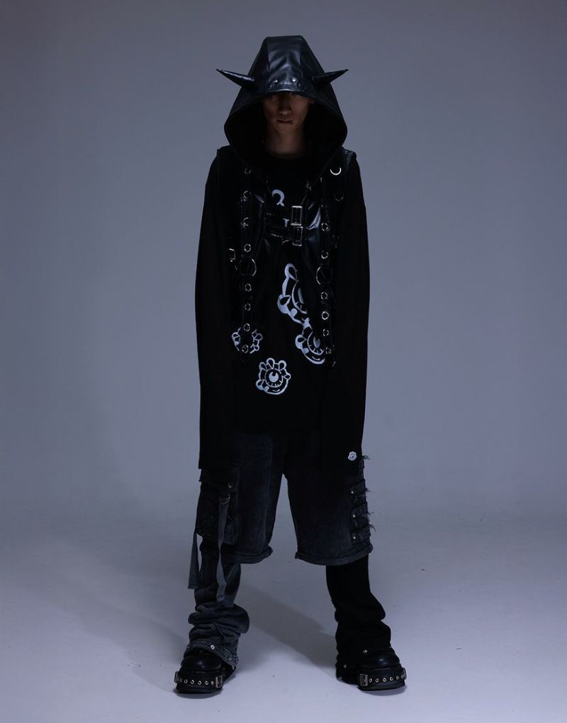 ドクロ総柄プリントのフード部分は脱着可能で、フロント部分には共地を骨風に丸スタッズで叩きつけており個性際立つデザイン。