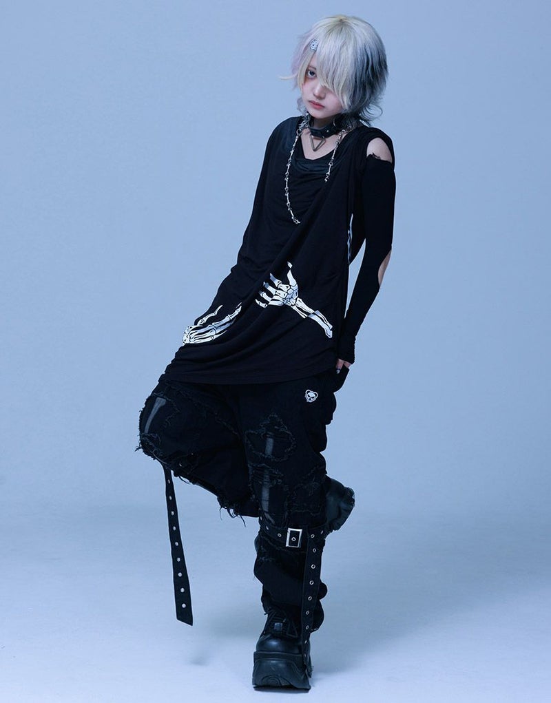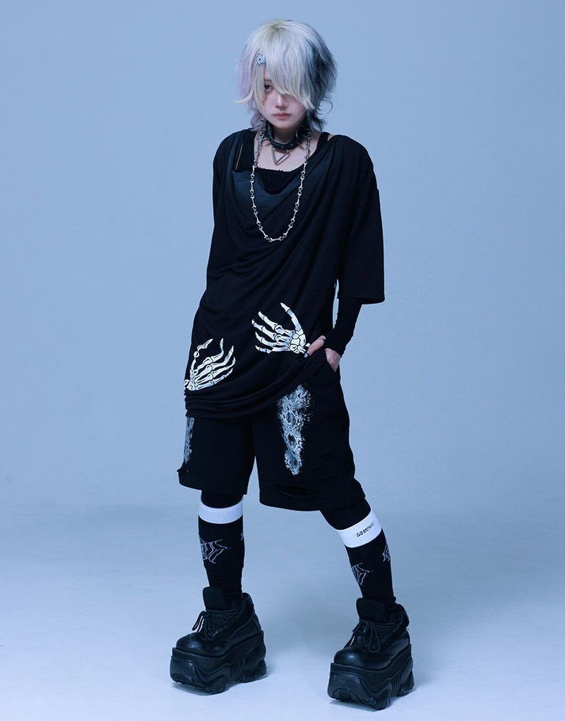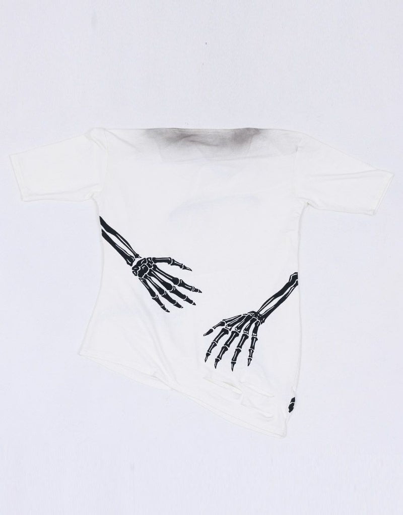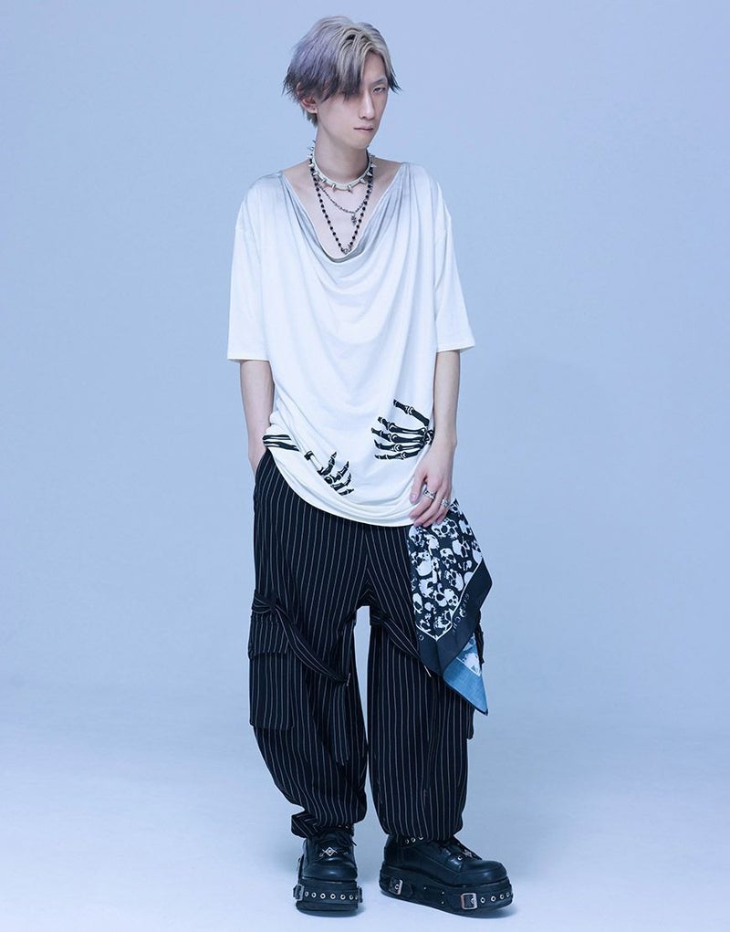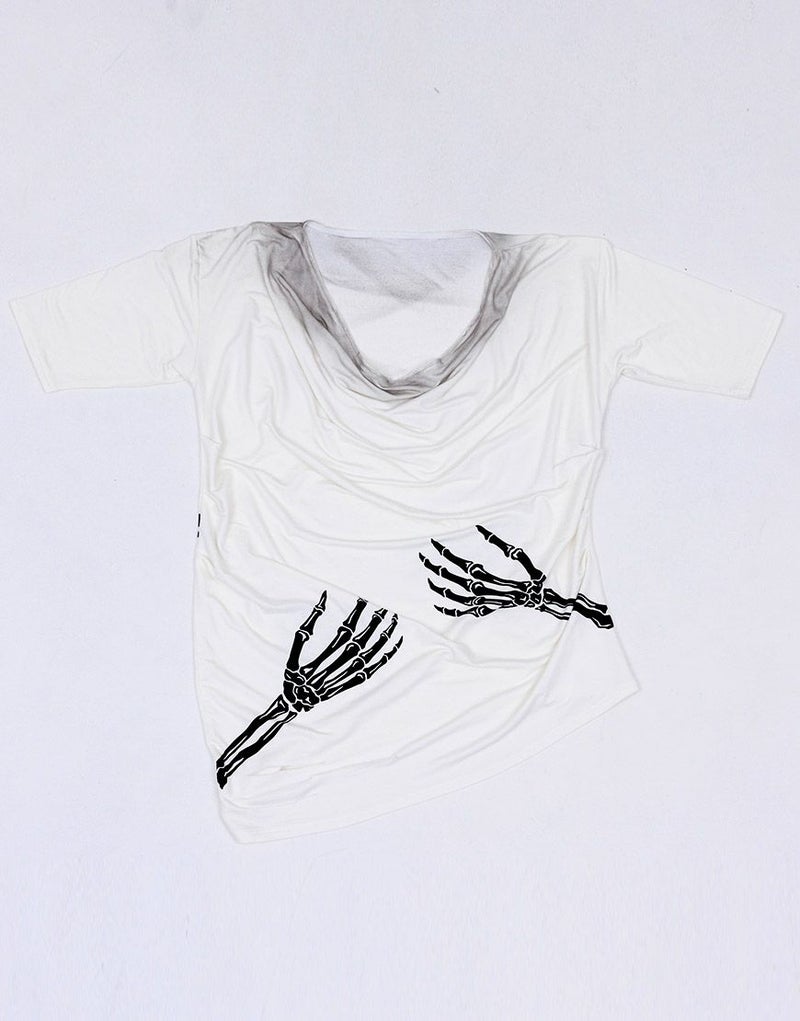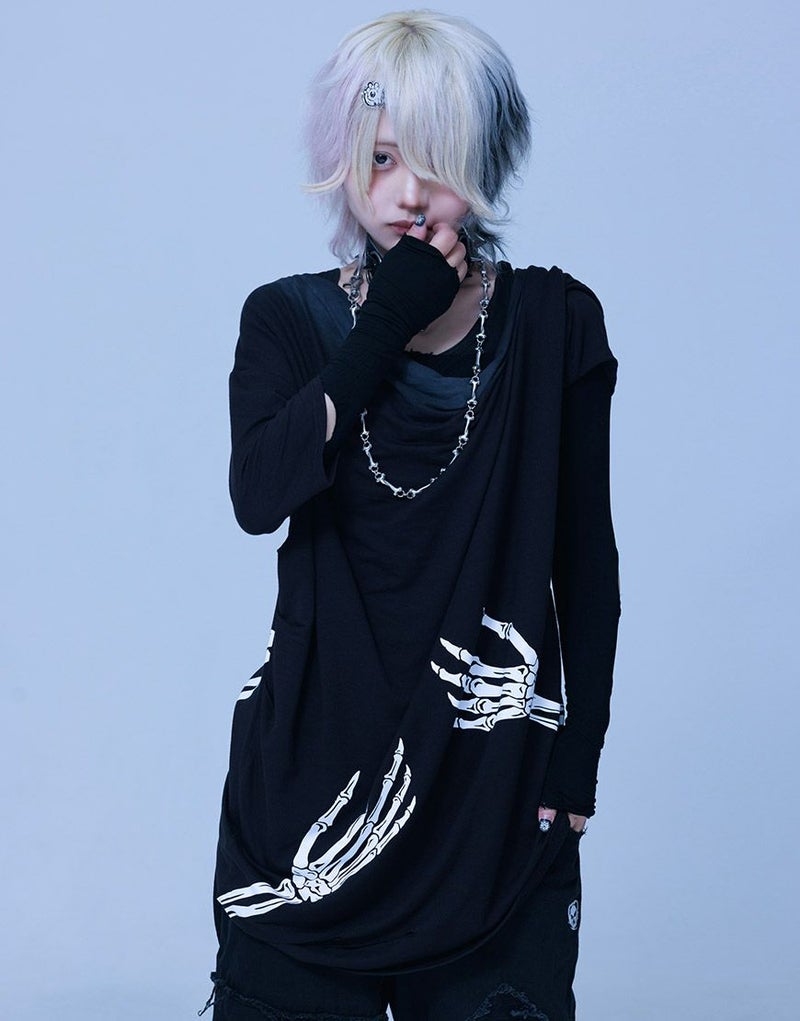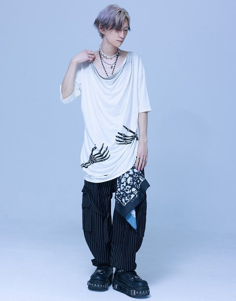 《ボクは骨になるまでゆるりと生きるつもりです手骨ドレープTEE》は、両サイドから前後にかけてプリントされた“腕の骨”が印象的。