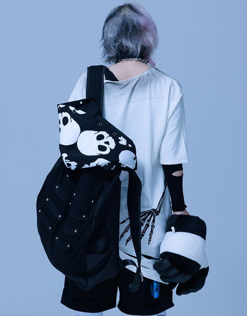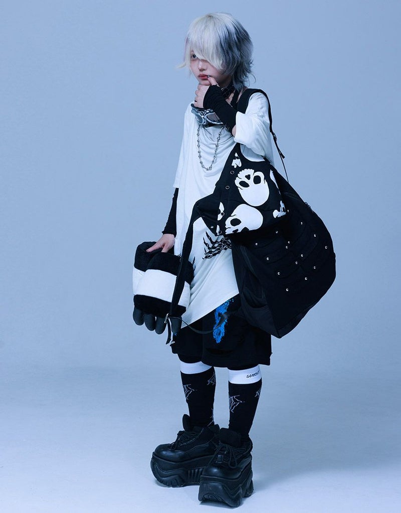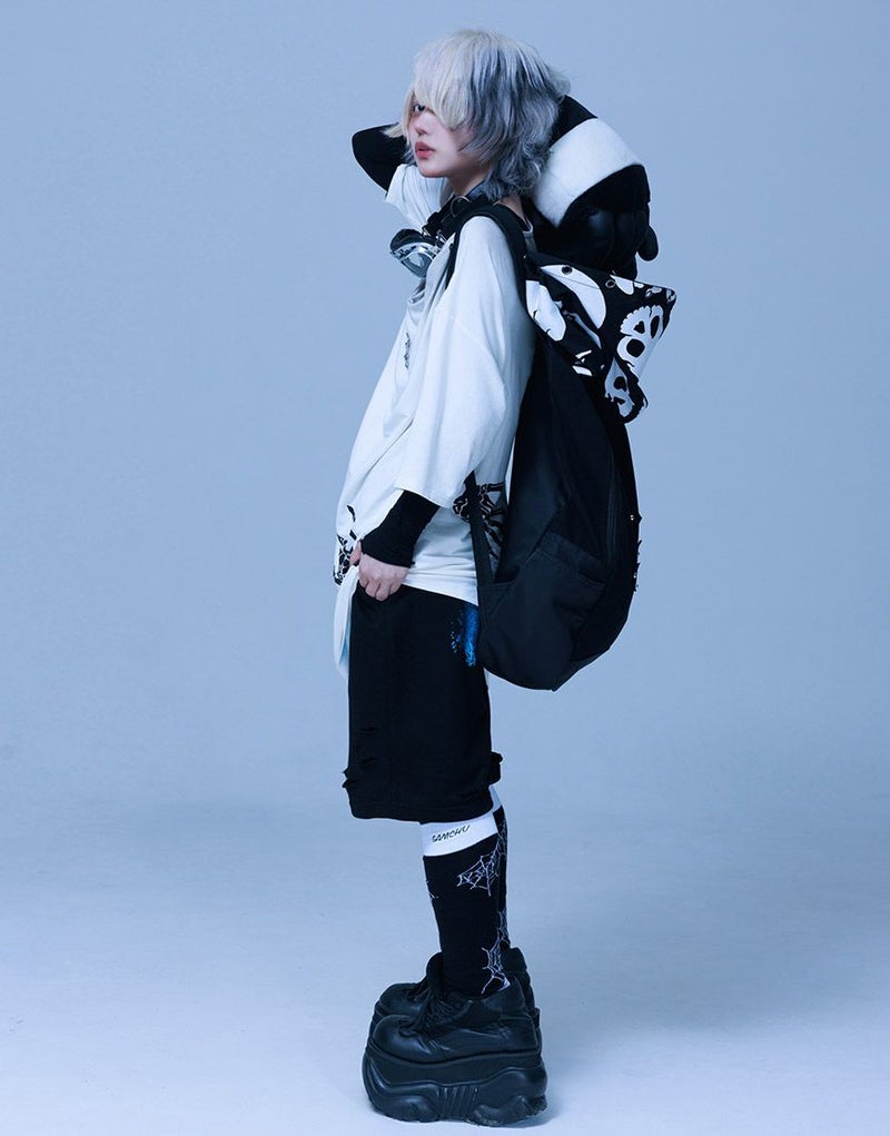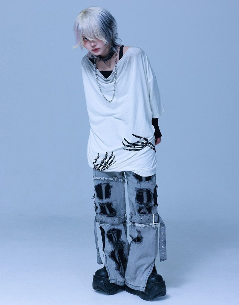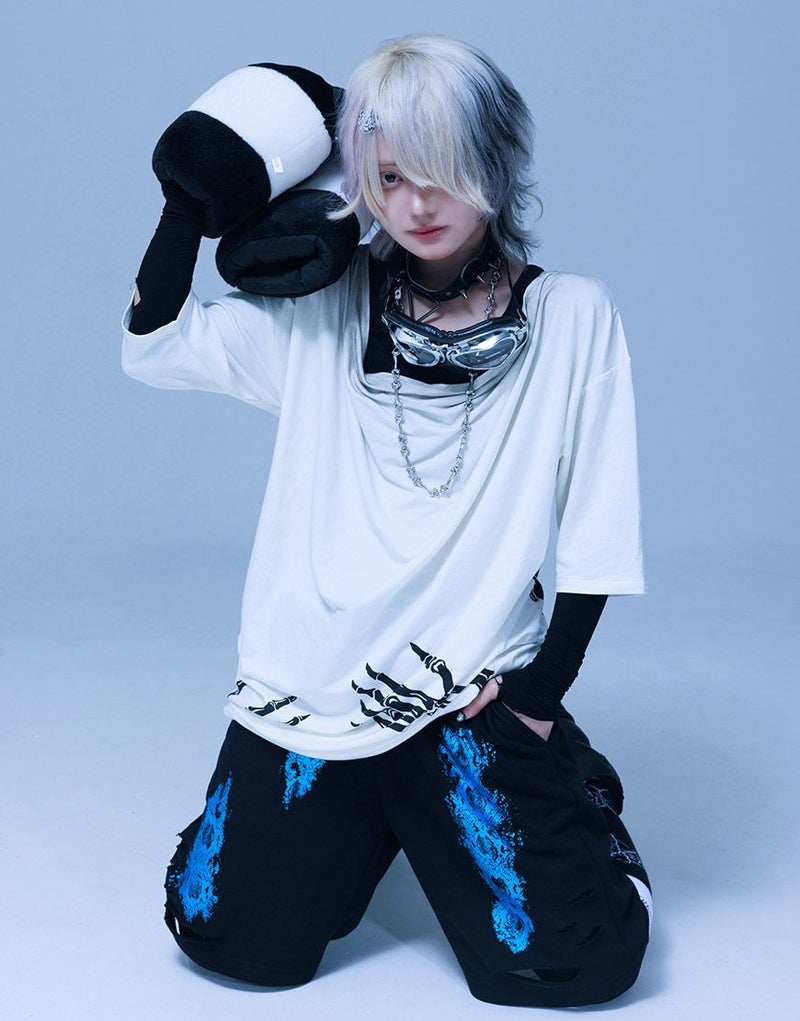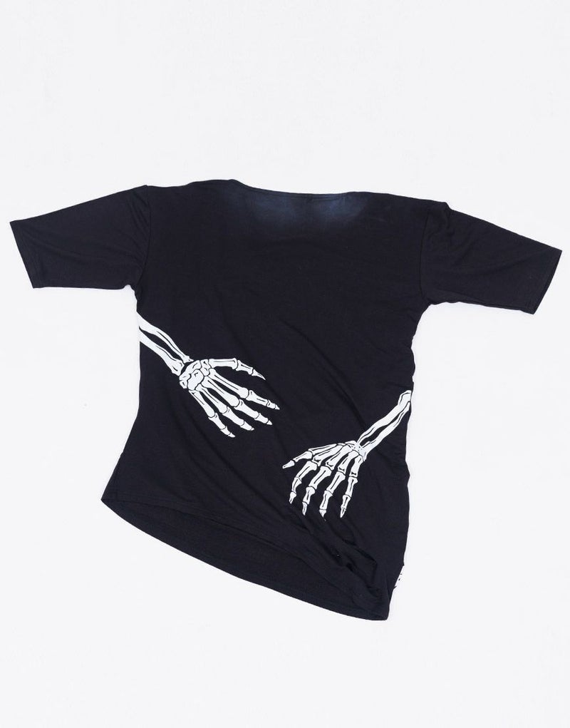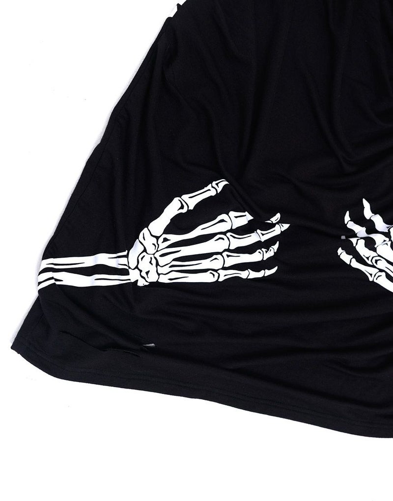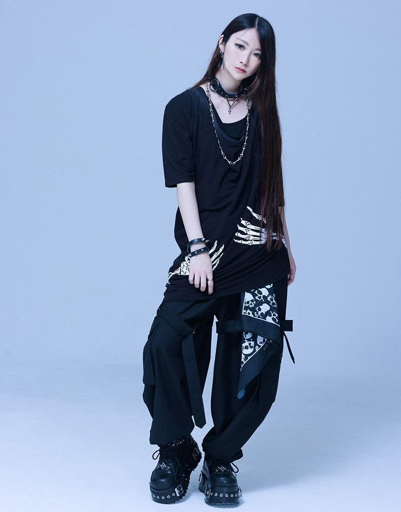 《ボクは骨になるまでゆるりと生きるつもりです手骨ドレープTEE》は、両サイドから前後にかけてプリントされた“腕の骨”が印象的。