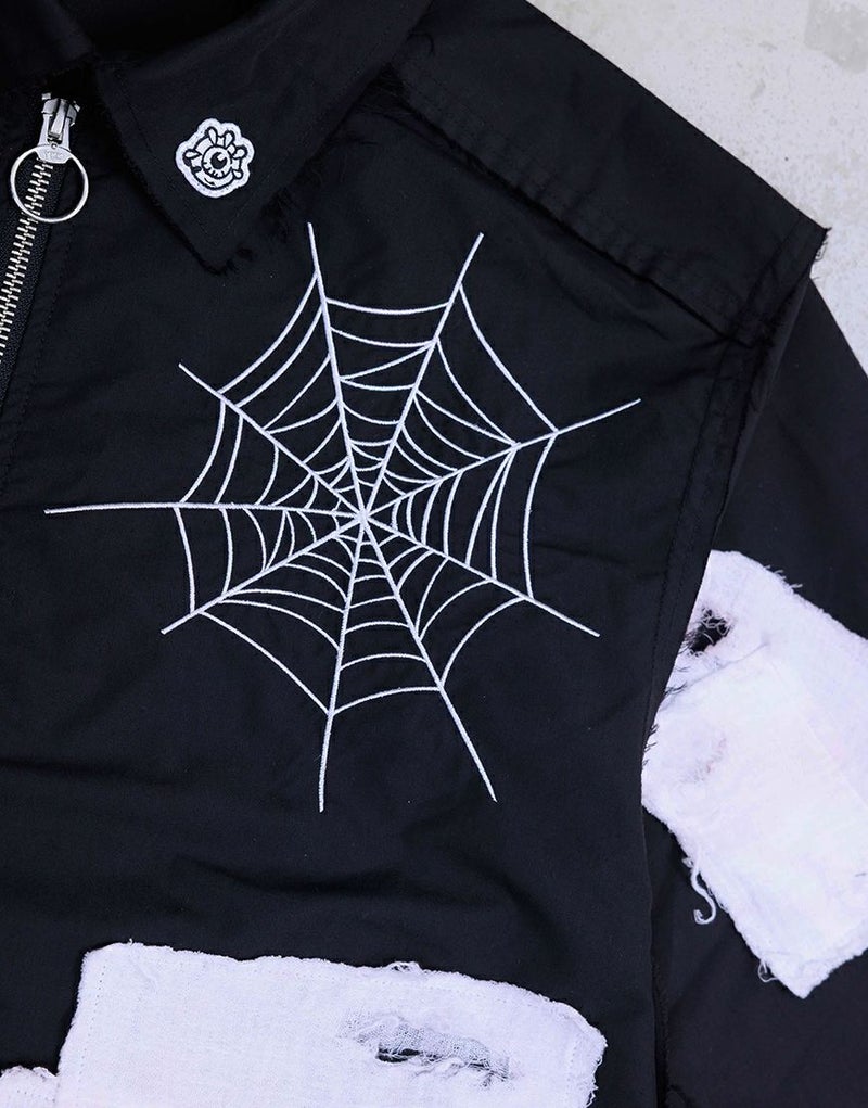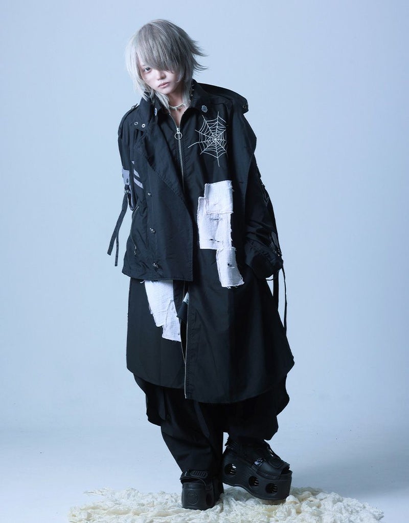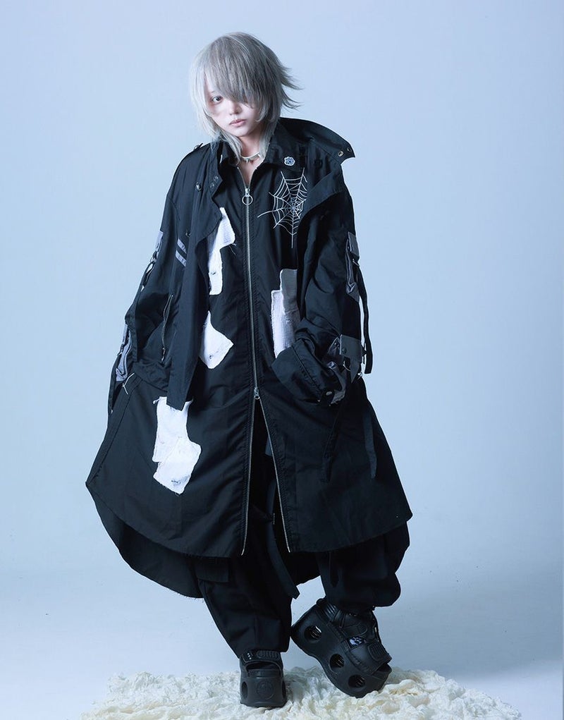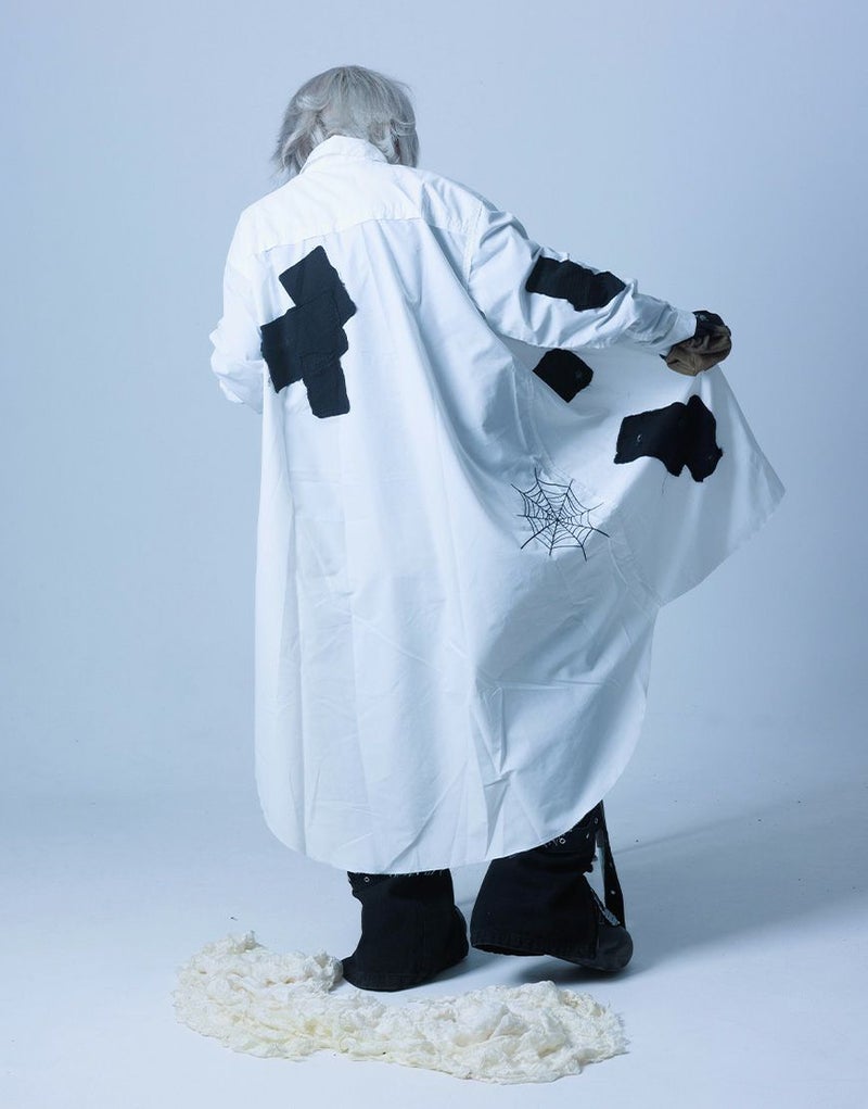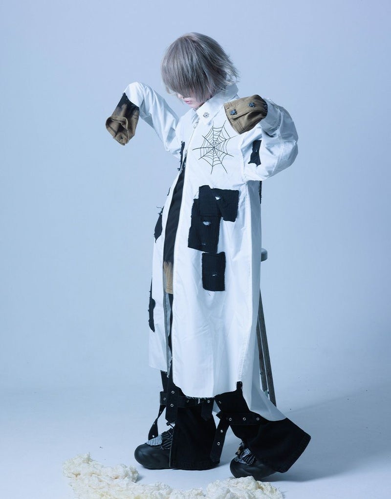 さらに前後には蜘蛛の巣アートワークを刺繍で落とし込み、生命と時間の絡み合いを象徴的に表現。