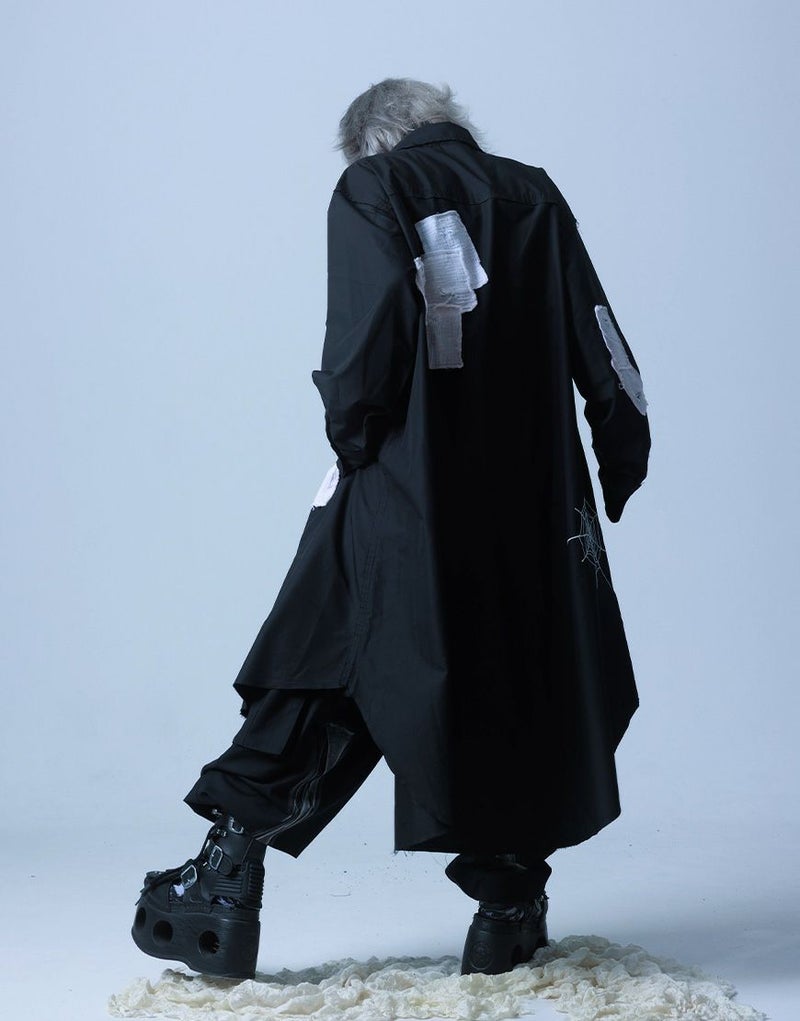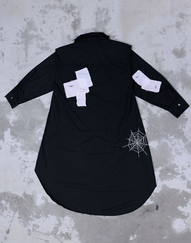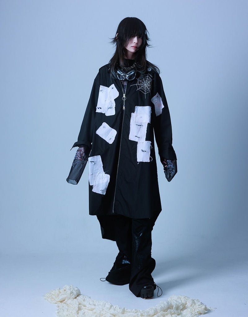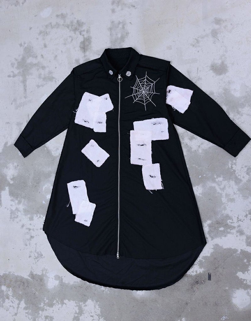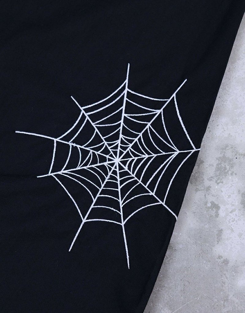 さらに前後には蜘蛛の巣アートワークを刺繍で落とし込み、生命と時間の絡み合いを象徴的に表現。