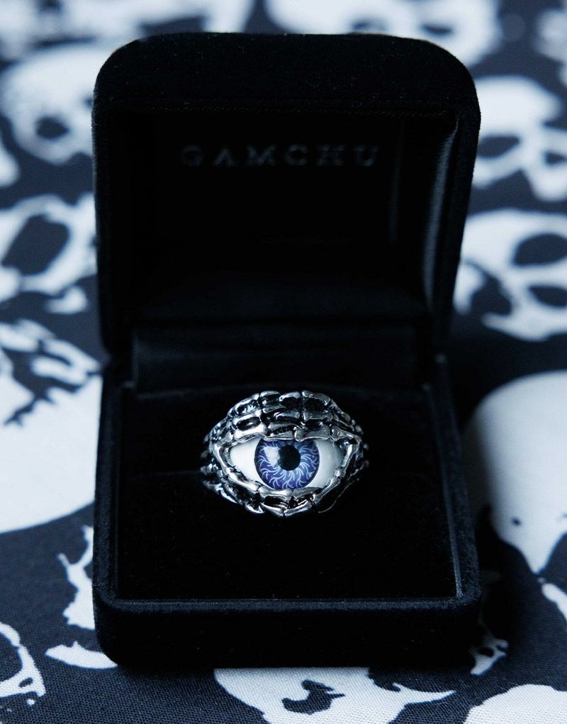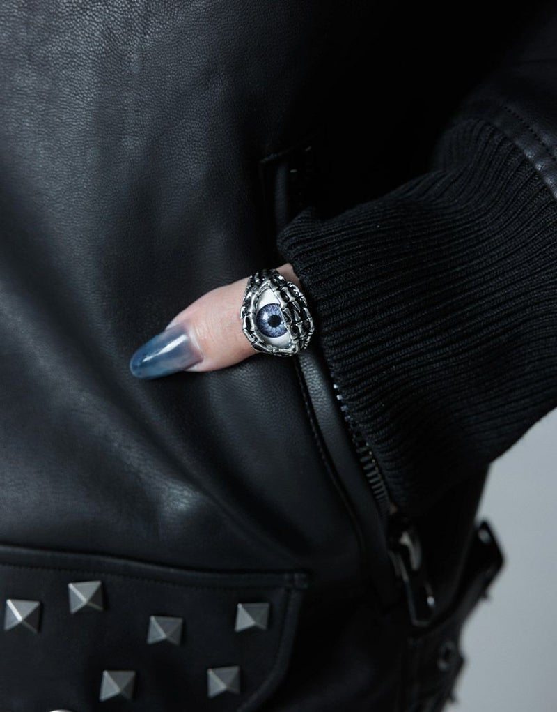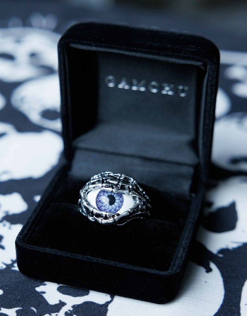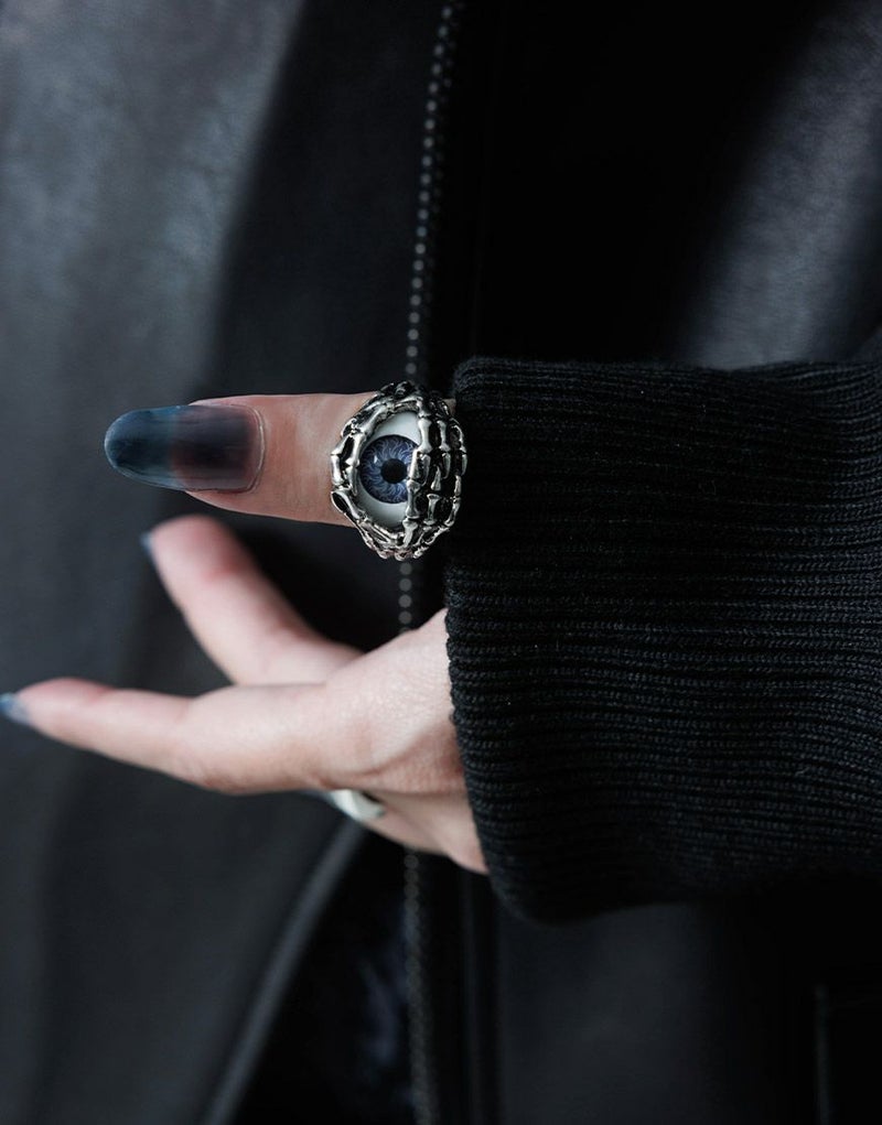 リアルな目玉モチーフと、指骨をイメージした立体的なデザインを組み合わせた、ダークでアーティスティックなシルバーリングです。