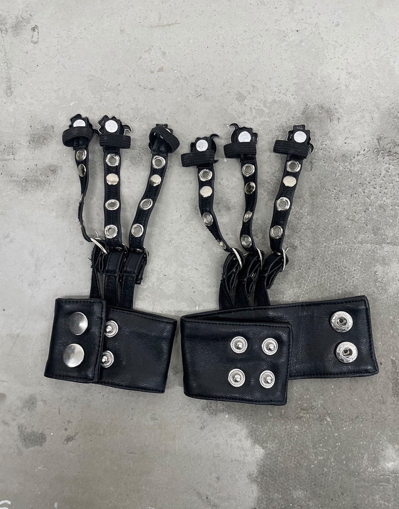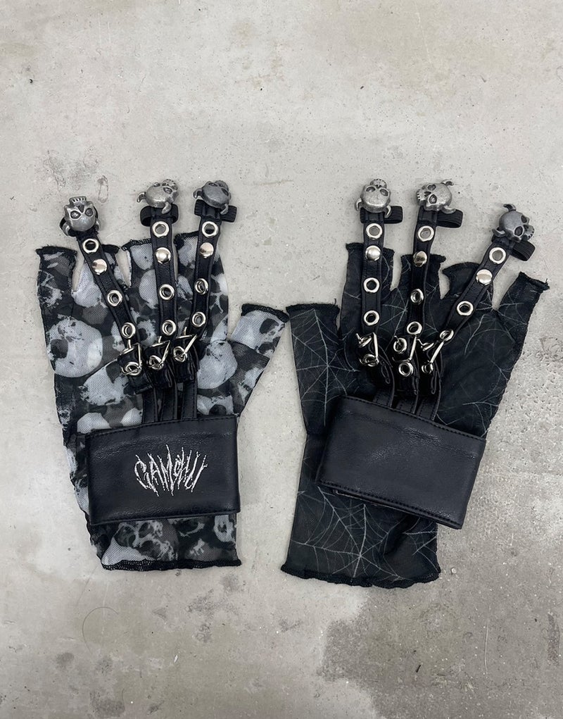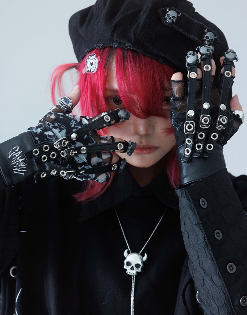 一方、PUレザーグローブは指先に骸骨リベットをあしらい、右手の手首にはGAMCHUのロゴ刺繍を配置。まさに死と生命の境界を超える、アンダーグラウンドな美しさを感じさせるアイテムです。