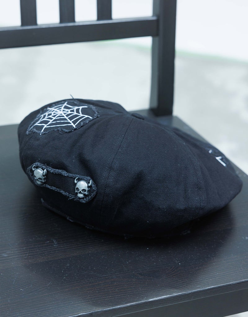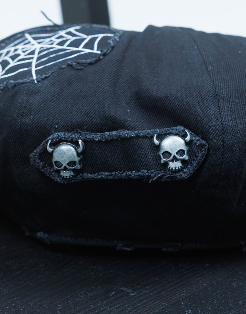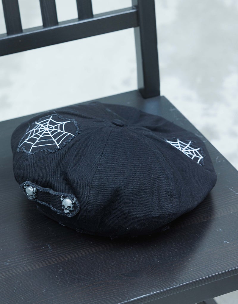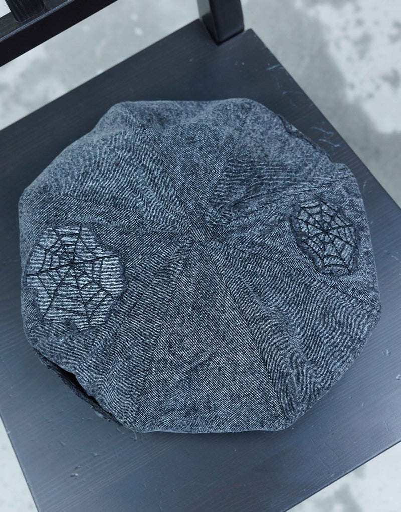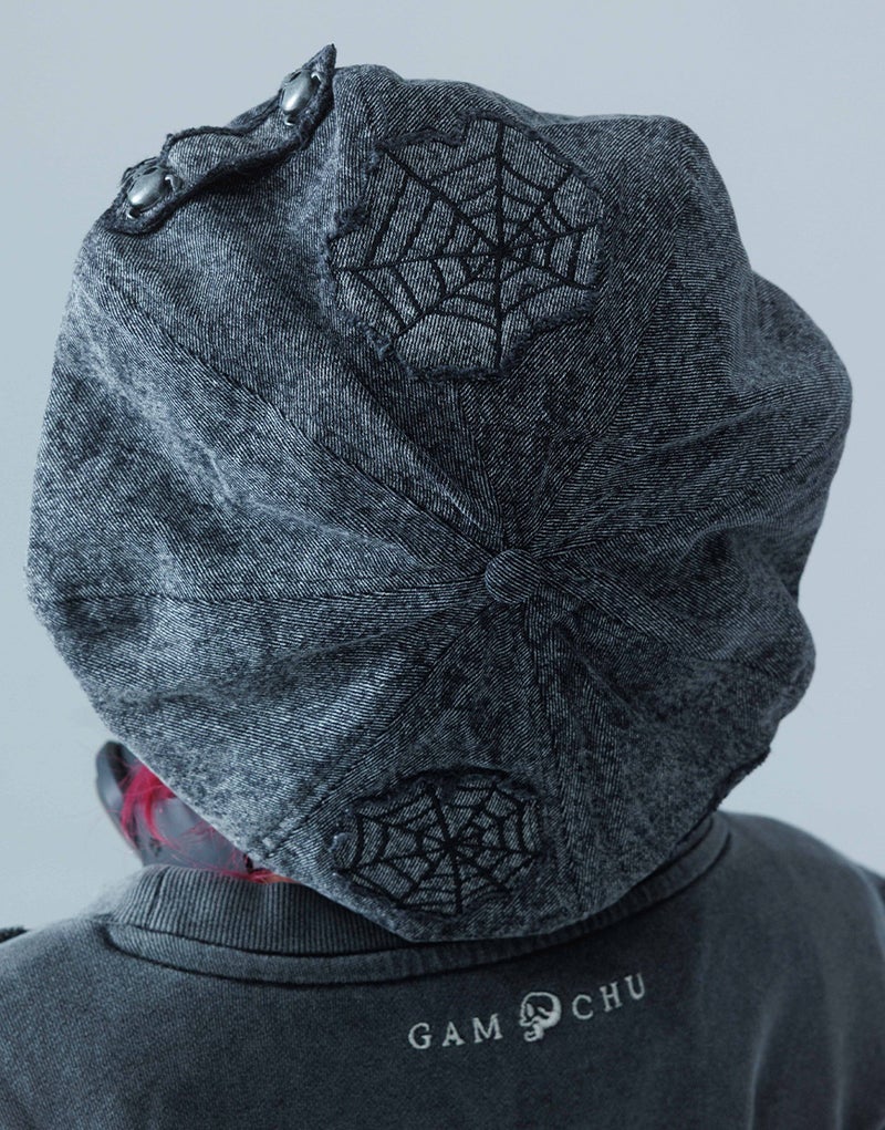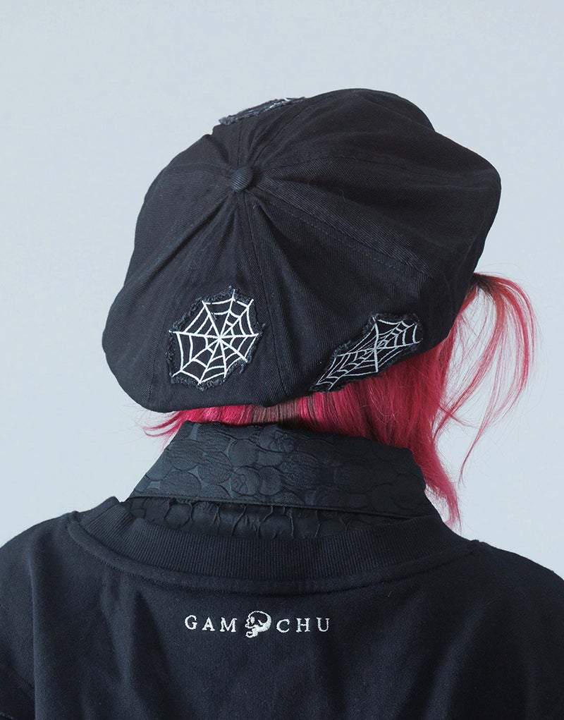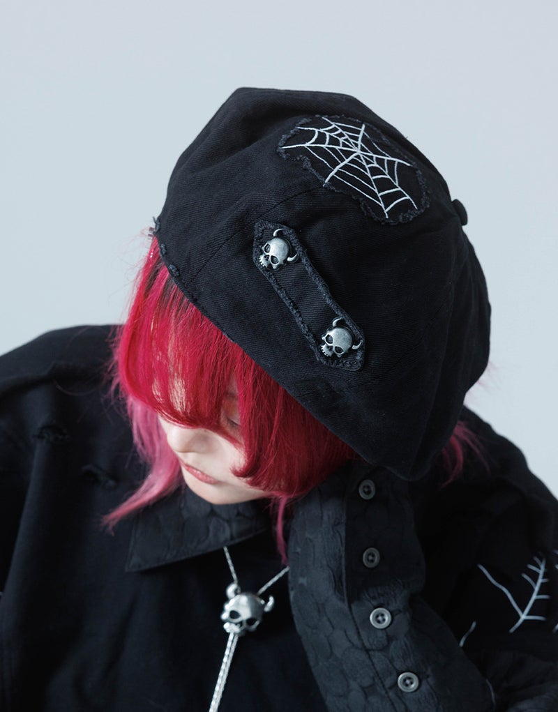 蜘蛛の巣をモチーフにした繊細な刺繍パッチが、暗く美しい世界観を表現。