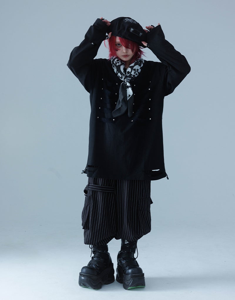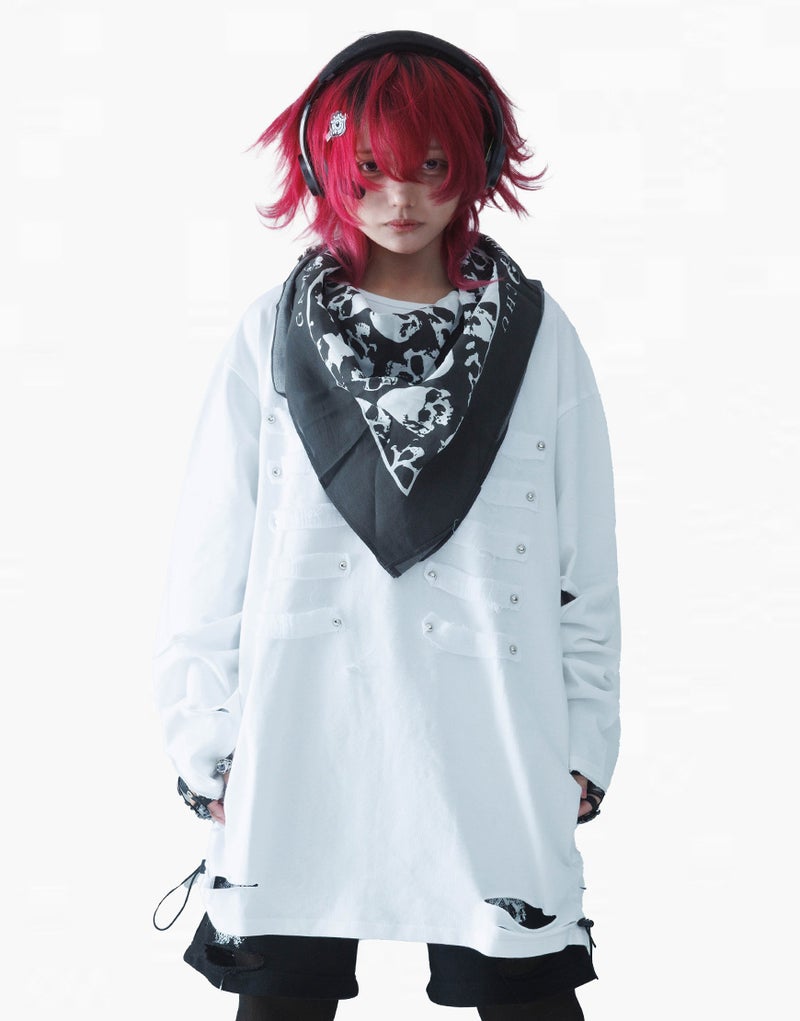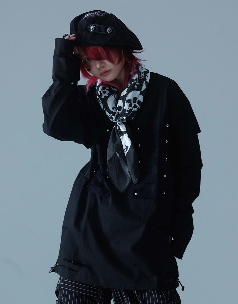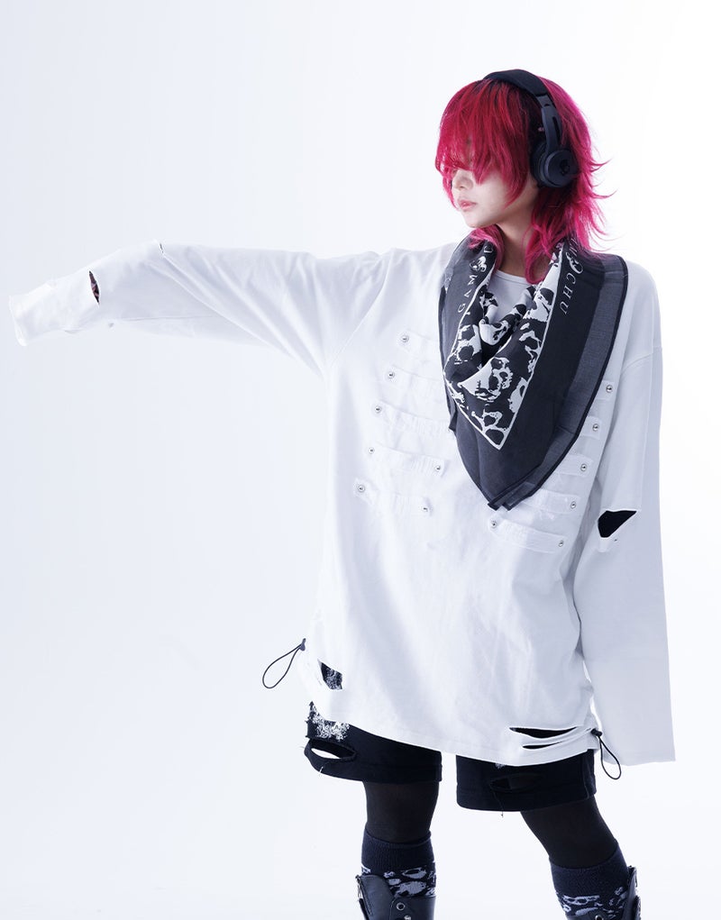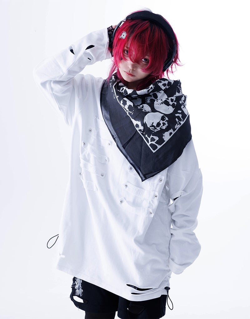 シルエットはゆったりめのユニセックス対応サイズ。さらに、Gamchuオリジナルのスカル柄バンダナ(80cm×80cm)が付属しており、アクセサリー感覚でスタイリングに取り入れることができます。