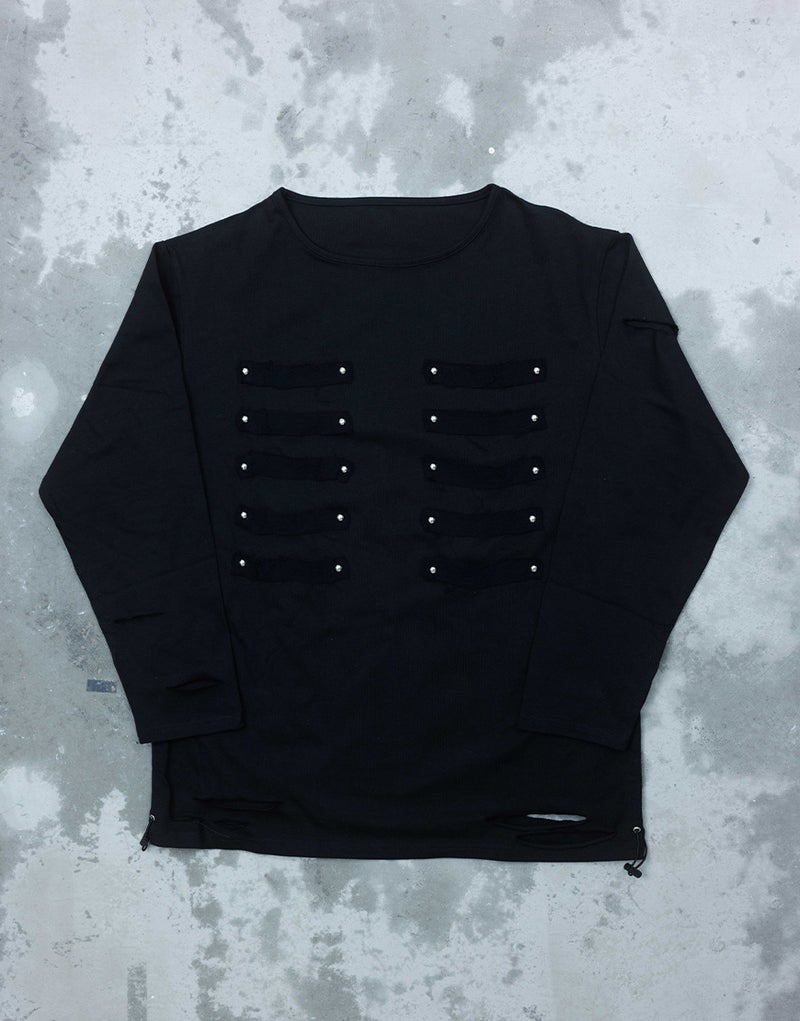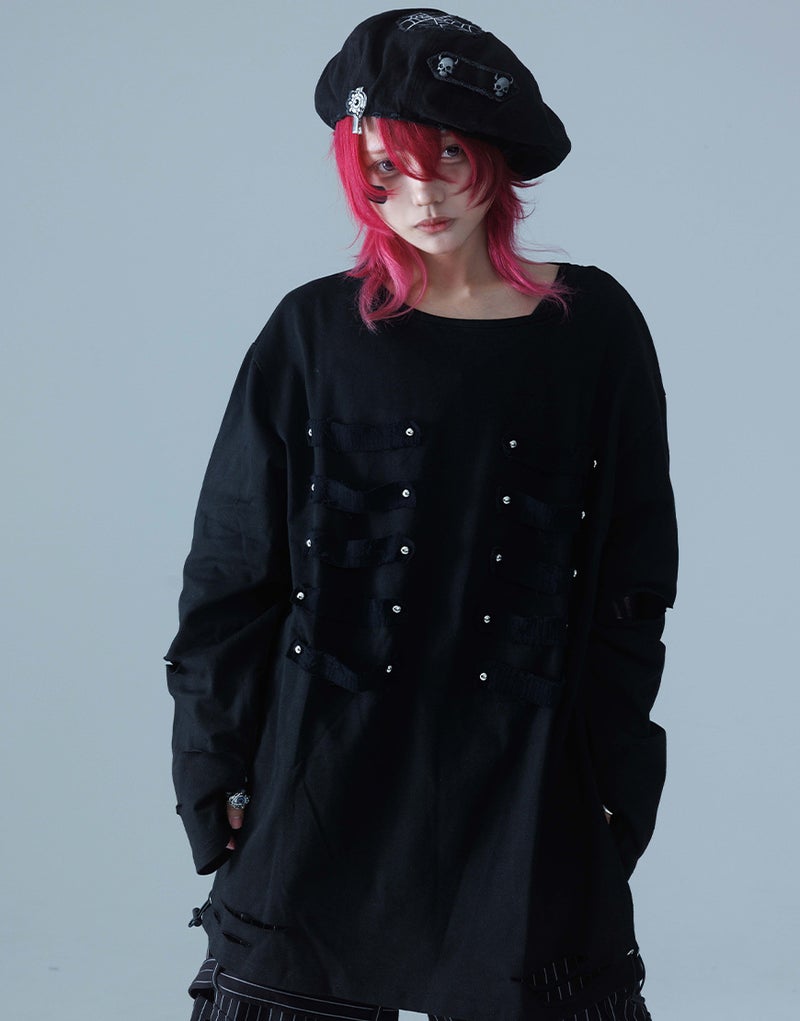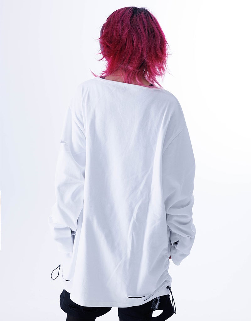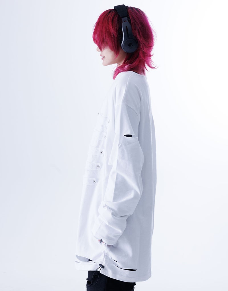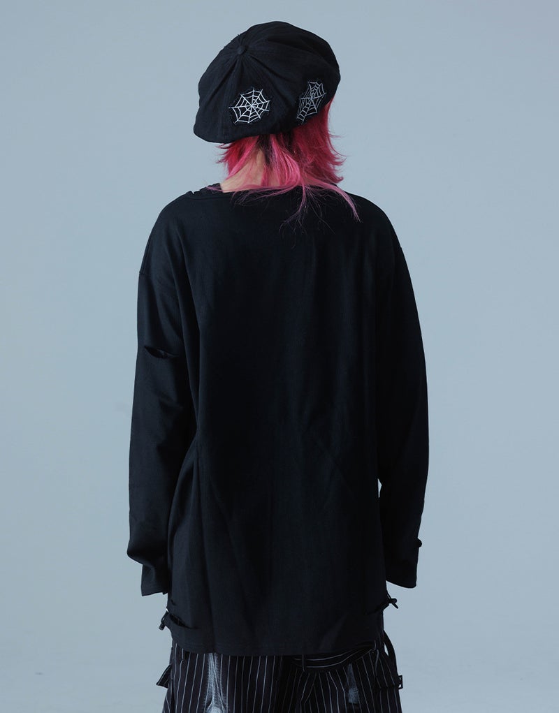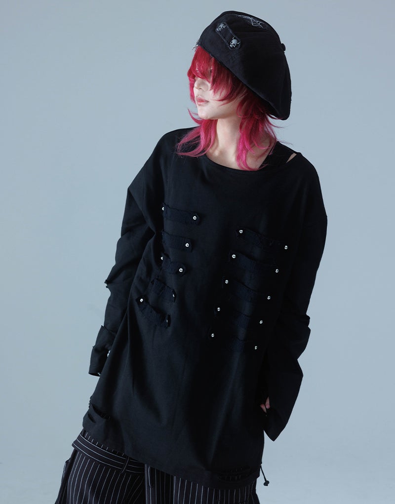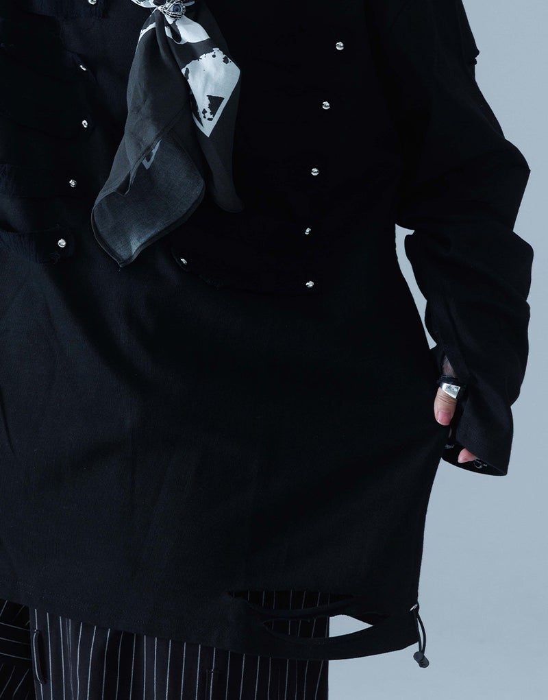 袖口には指ぬきデザインが施され、袖と裾にはカットダメージ加工が施されて、ヴィンテージ感と共に個性的なアクセントを加えています。