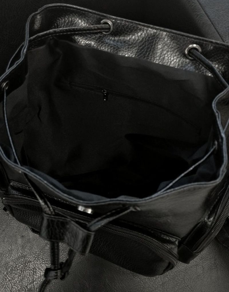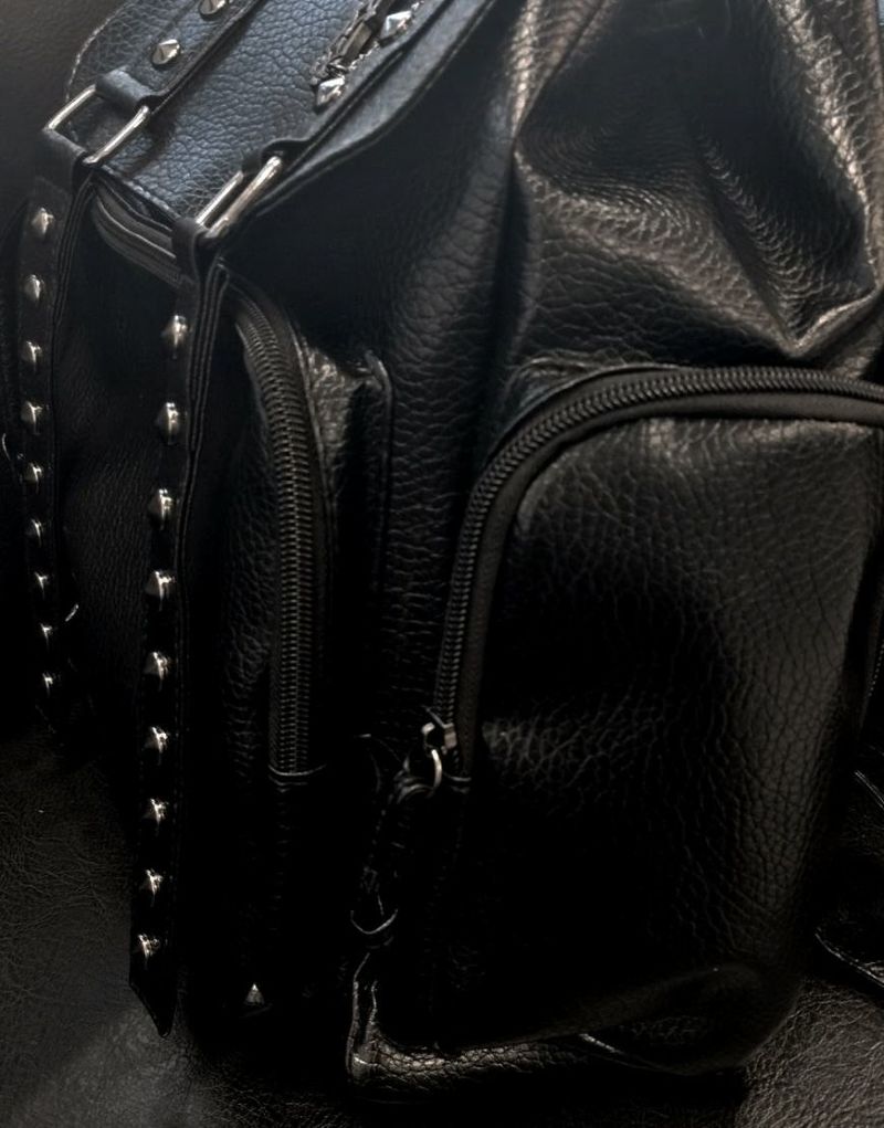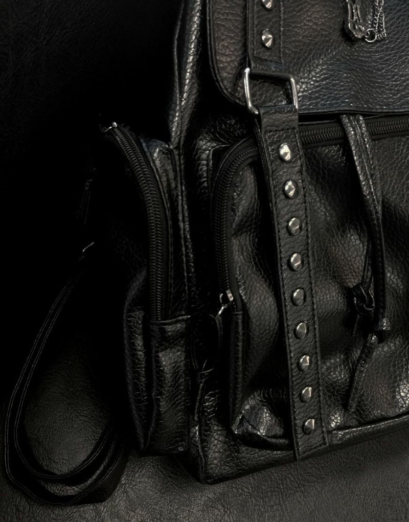 フラップ部分にチェーン付きのクロスチャームが配置され、スタッズ付きのデザインベルトが存在感抜群のリュック。