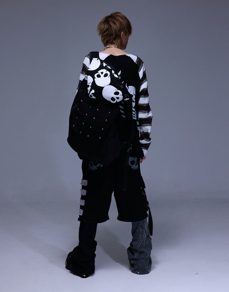 ドクロ総柄プリントのフード部分は脱着可能で、フロント部分には共地を骨風に丸スタッズで叩きつけており個性際立つデザイン。