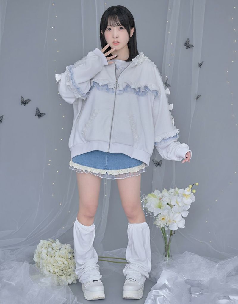 ililil【イルイルイル】より生クリームフリルのバブみ全開2wayパーカーが登場です。 まるで生クリームみたいなふわふわフードが主役 共地フリルと淡いチェックシフォンが、さりげない甘さを添えてくれるジップパーカー。 お袖は取り外しOKで、気分や季節に合わせてアレンジ自在♪ 「天使界隈さん」や「ゆめかわさん」にぴったりな、やさしいホワイトの一枚です。