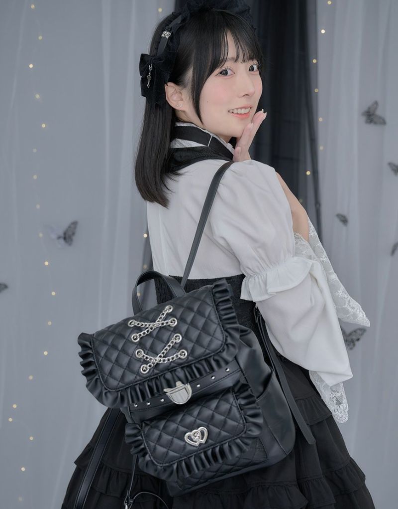 ilililより、地雷ちゃんのまっくろふりるの罪リュックが登場です。 ふりふり、でも毒っぽく。 地雷ちゃんの「かわいい」と「罪」を背負って出かける、真っ黒なごほうび。 広がるフリルとキルティングが印象的なリュック。 フタ部分にはクロスチェーンを、前ポケットにはハートのツイストロックを配し、ディテールの一つひとつに“地雷かわいい”を詰めこみました。 デイリー使いはもちろん、ライブ遠征や推し活にもぴったり◎ 大人でも持ちやすい上品なブラックカラーで、甘すぎないバランス感も魅力です。